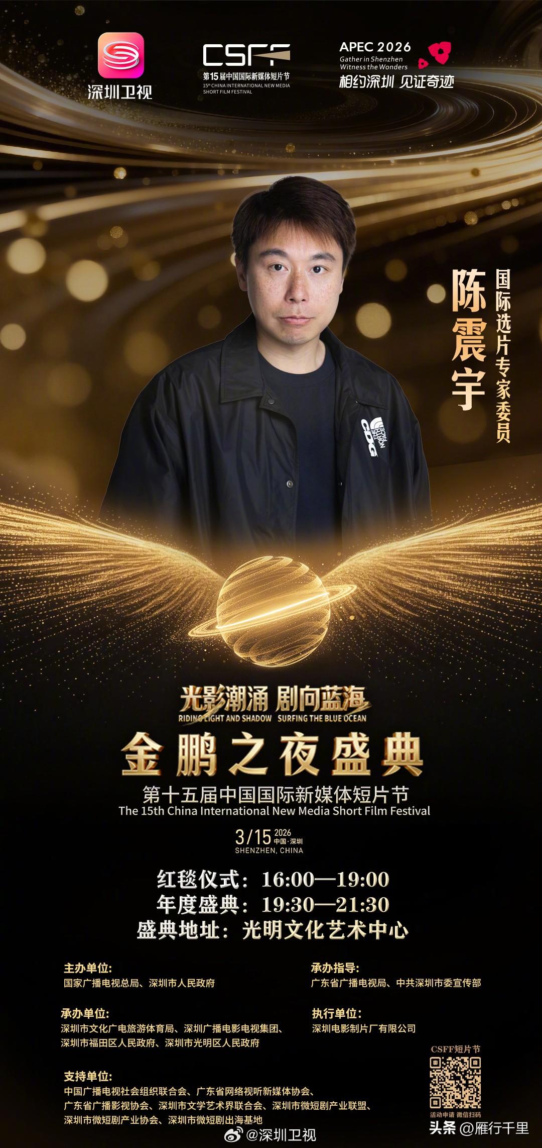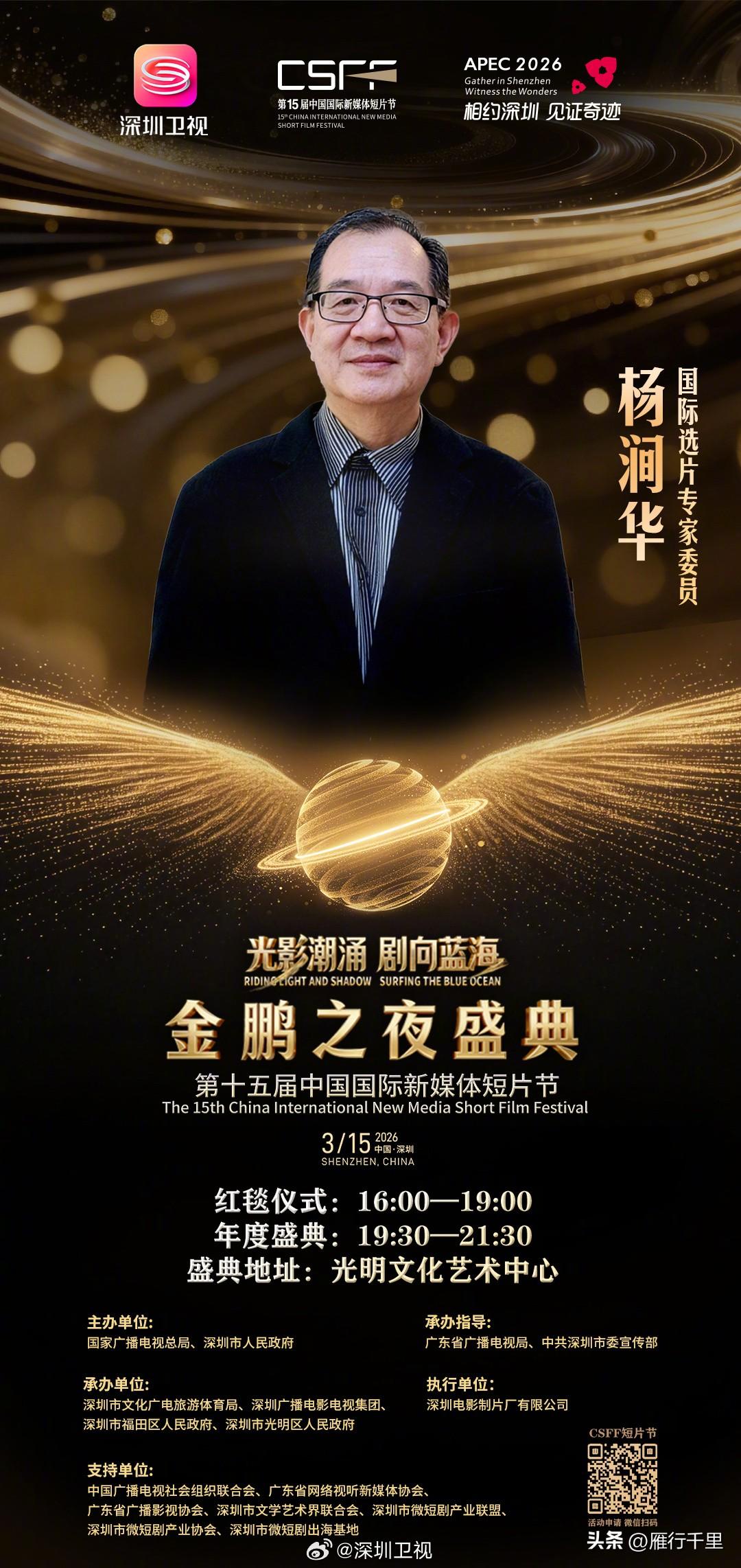 今晚「金鹏之夜」,郭靖宇、赵雅芝、奥斯卡得主,深圳光明见 今晚19:30点,深圳光明文化艺术中心,第十五届中国国际新媒体短片节的重头戏——「金鹏之夜」盛典启幕。 国际专家选片委员会集体亮相,著名导演郭靖宇、第88届奥斯卡最佳音效剪辑奖得主大卫·怀特、演员赵雅芝和倪虹洁、亚洲艺术电影节组委会主席杨涧华和陈震宇,与海内外优秀影视人、剧组代表一同赴约。 今晚的「金鹏之夜」在原有11项荣誉之外新增了两个:「年度精品短剧」和「APEC经济体精品短片短剧」。 一个是对微短剧精品化方向最实在的鼓励,一个是专为今年APEC主题量身设立的国际荣誉。 每一项新增背后,都能看到这个行业真实变化的方向。 开场秀有全息投影,火山引擎和腾讯云会带来AIGC前沿分享。 「一节一会」这三天,科技和影视一直在彼此靠近——从展会上的技术演示,到今晚光明舞台上的视听体验,深圳把这两件事放在一起,做出了自己的答案。一节一会 中国电视剧制作产业大会