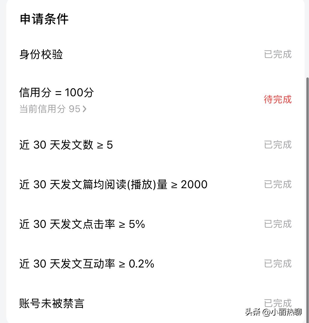 差点能认证头条新锐创作者了! 之前想认证头条新锐创作者,可是近30天发文篇均阅读量大于2000这个总是完不成。 最近发的文章流量都挺不错的,这个终于合格了。 可是因为前两天发了一篇文章因为涉嫌抄袭,信用分被扣了五分。 这下信用分等于100分的这个又不合格了。 如果十天信用分不扣分的话,就会加十分,那么我的信用分就恢复到100了,这一项就合格了。 可是我感觉,等到我的信用分回复的时候,近30天发文篇均阅读量大于2000这个恐怕又要不合格了。 想成为新锐创作者也太难了!
