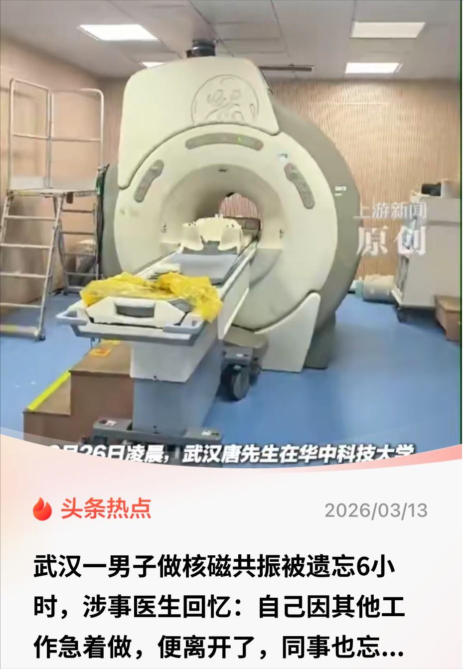 湖北武汉,一男子因身体不适去医院做核磁共振检查,当男子躺在机器上后,头部被医生固定,脸部也罩上了面罩,让男子怎么也没想到,这一躺就是6个小时,期间,无论男子如何求助大喊,均无人回应。 太吓人!武汉一哥们做核磁共振被"忘"在机器里6小时:医生已停职,竟然还说没影响? 2月26日深夜,武汉同济医院汉口院区的监控室里,屏幕上跳出一个绿色的勾——"检查完成,0点10分"。 可唐先生压根没走。 机器轰鸣声像要把耳膜震穿,他喊破了嗓子:"医生!有没有人在?" 外面的世界已经把他当成了"已完成"的数据。 这就是最诡异的地方——人明明在机器里喊救命,电脑系统却在那儿假装工作早就干完了。 唐先生因为脖子疼来做检查,医生把他推上检查床,固定好头部,戴上面罩。 走之前,他在电脑上提前点了"检查完成",顺口跟同事说了句"人还在里头"。 系统显示他已经走了,所以保安和民警的搜寻全都扑了空。而他本人,正在那个狭小的舱体里经历着这辈子最绝望的6个小时。 只能喊一阵,歇一阵,再缓口气继续喊。手机孤零零躺在窗台外的桌上,够都够不着。 赶紧叫来保安,解开固定架,这台"活机器"才终于落了地。 但那位医生的解释让人大跌眼镜:他说当时忙晕了就把人给忘了,底下同事下班也没检查。更离谱的是,他还表示——躺这一夜对身体健康其实没啥影响。 这话说得倒轻巧。 核磁共振确实没有辐射,机器一直亮着也不奇怪。可6个多小时的恐惧,谁能补偿?那种被困在狭小空间里,喊破喉咙没人应答的绝望,难道不算伤害? 现在双方在赔偿数额上谈崩了。医院的意思是:建议走法援。 从法律角度看,唐先生花钱看病,相当于和医院签了份服务协议。根据《民法典》,如果因为医生疏忽让患者受损,医院必须赔钱。 可问题在于——医生坚持认为对身体没影响。如果没有实体性的健康损害,法律上的大笔赔偿确实有难度。 说白了,这就是在争论"吓唬人"算不算违法成本。 网友们看完这事儿直接炸锅了。有人说:"这简直就是重大事故!去做过核磁的都知道,脸贴着机器,空间狭小得要命,被关一整夜,正常人都得憋疯!" 也有人觉得医生太累了,高压下工作难免出错,既然道歉了就别揪着不放。 可医疗安全从来不能靠"自觉",得靠"硬锁"。 必须得安排双人核对,或者干脆加个限制——人没下床,系统死活点不了"完成"。甚至能不能给核磁机器配个呼叫器,让患者在绝望时有个能发声的出口? 很多人这辈子可能只做几次核磁。在医生眼里,你可能只是当天的第N个编号,但在患者眼里,那一刻他把整条命都交到了医生手里。 这种信任的"塌方",光靠两个医生停职恐怕填不平。 技术即便零辐射,责任心的缺失却带毒。 信息来源:上游新闻