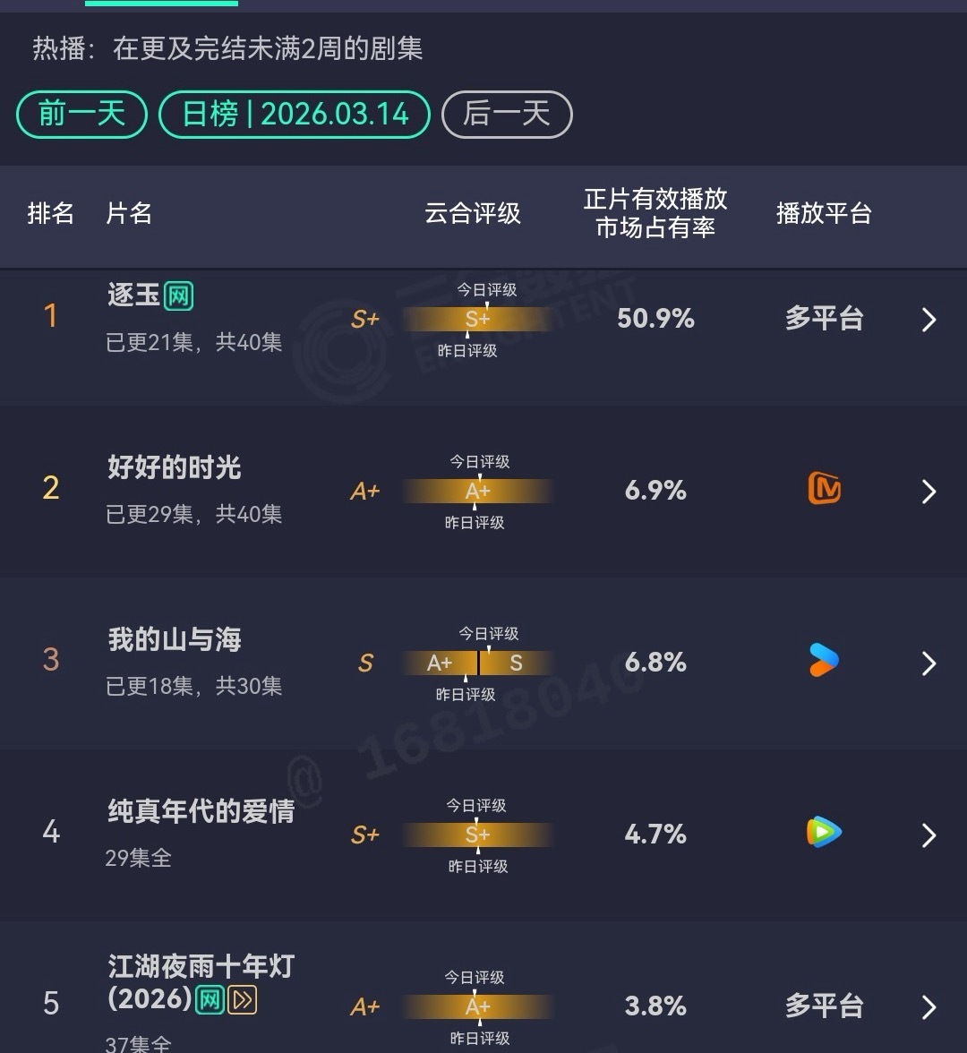 逐玉云合破50%张凌赫 田曦薇逐玉昨日云合达到了50.9%,播放量破亿,成为云合历史第三个破50%的剧了。