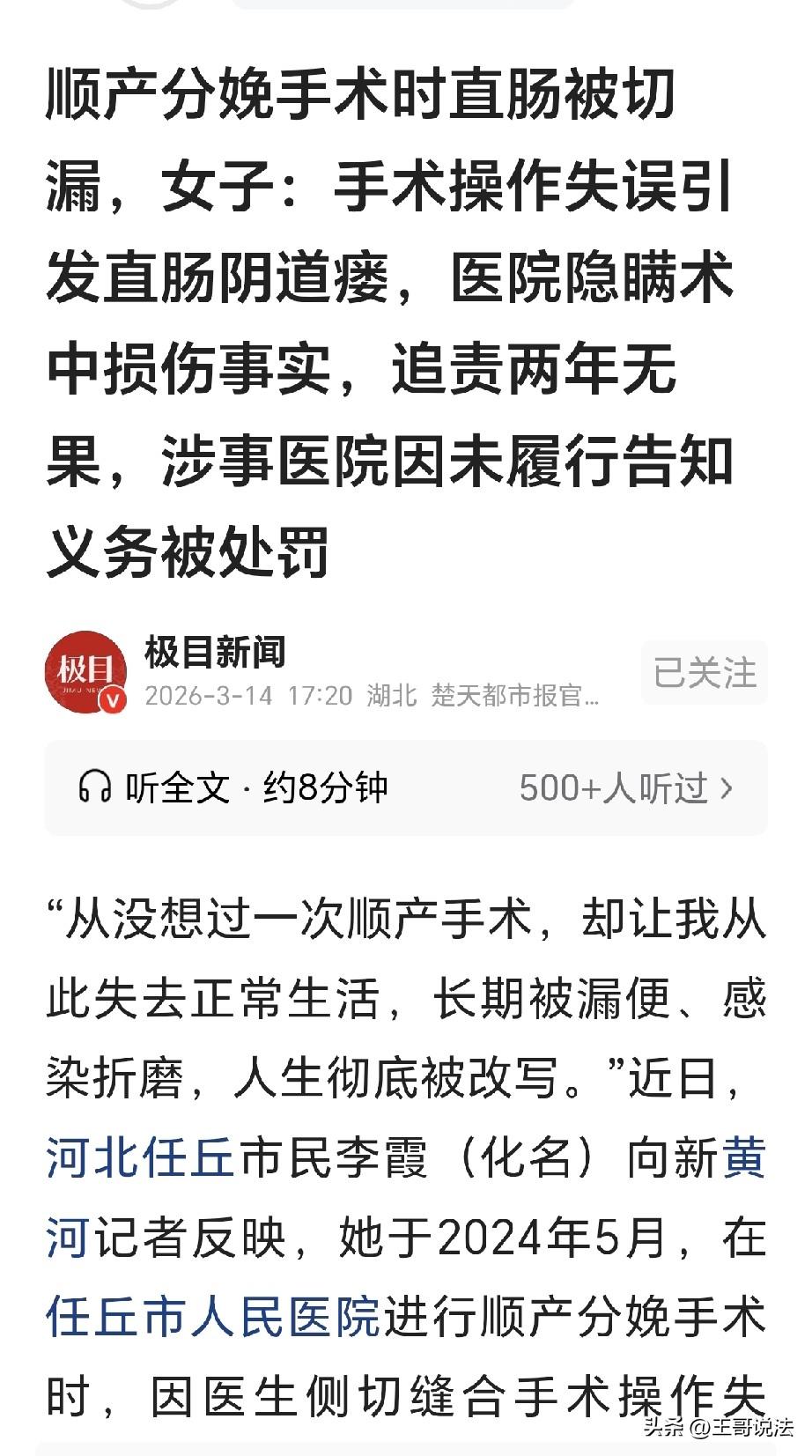 “太可怕了!”河北任丘,一女子生完孩子,3天之后,从阴道排出大便,女子急了,这才知道医生在她生孩子时侧切,直肠被切漏,可医生隐瞒真相,没采取任何措施,从而导致了直肠阴道瘘,可女子感染严重,错过了最佳治疗期,女子漏气漏便,穿纸尿裤,靠输营养维持身体,女子找医院理论,医院推诿敷衍,涉事医生还在继续接诊看病,啥事没有,女子急了,多方投诉,卫健部门的答复令她崩溃了。 李霞十月怀胎,转眼就到了生产的日子,2024年5月14日,她产下了一个健康的宝宝。 可她没有想到,她的噩梦从今天开始了。 李霞身体健康,生孩子时也是顺产,可顺产时做了侧切,医生也给她进行了手术的缝合。 做完了手术,医生说她和孩子母子平安,医生还叮咛,要她只能吃无渣的流食。 她在住院期间,护士给她了护理,可这期间,谁也没有说过手术中的问题。 李霞原本以为,用不了多久的时间,身体就会慢慢的恢复,可万万没想到的是,3天之后,李霞上厕所,突然发现,从阴道里排出来大便! 李霞吓得脸都变了,这是怎么回事,怎么自己大便已经不受控制了! 经过诊断,医生说她是直肠阴道瘘,因为情况危急,赶忙给她转院处理。 可是到了第二家医院一看,医生发现李霞的伤口处已经重度感染,这家医院没有救治的能力,李霞又被转往上一级的医院。 经过一番细致的检查,医生查出李霞的直肠下端,有指尖大小一个瘘口,并且瘘口处严重感染,已经错过了最佳手术时间。 医生只好先做抗感染治疗,只有等感染好转,才能考虑做手术治疗。 而之前那家医院,只承认是在缝合侧切伤口时把直肠给缝穿了。 那既然缝穿了,为何没有采取补救措施?为啥要隐瞒此事,为啥不给病人说明情况? 就是因为医生的不负责任,这才造成了李霞伤口的重度感染,李霞气不打一处来,这是把病人的健康当做了儿戏? 之后一年,李霞一直在做抗感染治疗,可2025年做手术时,手术失败了。 李霞痛苦万分,她的身体遭受到了重创,如果找不到能做手术的医生,她就得做造口手术。 李霞的生活受到严重的影响,她一年四季都穿着纸尿裤。 她不敢外出,随时都会漏气漏便,她生怕身上会有难闻的气味。 她心里自卑,已经无法正常生活,她身体每况愈下,靠输营养液维持身体的机能。 之后,她又患上了风湿病,她年纪轻轻,却因为一场医疗失误,造成她现在的痛不欲生。 李霞找医院讨要说法,可医院推诿,敷衍了事。 李霞万般无奈,找到媒体公布此事,记者发现,在李霞分娩记录上显示,肛查发现有一针可吸收线穿透直肠黏膜,直肠指诊配合下拆除缝线。 而且李霞出院记录上写着,产后3天发现直肠阴道瘘,家属协商后转上级医院治疗。 可是,对直肠的损伤,医生并没有告诉李霞,也没有采取任何治疗,直到李霞出院,这才看到了手术记录。 之后涉事医生将李霞拉黑了,那医生依旧正常上班接诊,没有受到任何的惩罚。 李霞希望医院能给她个交代,可医院没给她任何说法。 之后李霞继续投诉,卫健部门出具了一份告知书,上面显示,经过调解,该医院主动提出给李霞垫付20000元,遭到家属拒绝。 可李霞和家属根本不知道有这回事,李霞不肯放弃,又在多渠道投诉。 之后,卫健部门对医院做出罚款50000元的处罚决定。 可李霞认为,为啥涉事的医生却没一点事,可卫健部门回复,不能一案两罚! 李霞崩溃了,找媒体求助,李霞认为,医院和医生是两个不同的主体,都该处罚! 可是目前,医院仍然没有任何回复。 李霞医疗费已经花了十几万了,她身体不行了,钱也没了,无论如何,接受不了这样的结果! 《医师法》第55条规定,医师在诊疗活动中未尽到告知义务,造成患者损害的,由主管部门责令改正,给予警告;情节严重的,责令暂停六个月以上一年以下执业活动直至吊销医师执业证书。 医院和医生是独立的责任主体,处医院不代表免除医生的个人责任。 《民法典》第1218条规定:患者在诊疗活动中受到损害,医疗机构或者其医务人员有过错的,由医疗机构承担赔偿责任。 李霞可以走法律程序,主张医疗损害赔偿,要求医院支付医疗费,残疾赔偿金以及损害抚慰金。