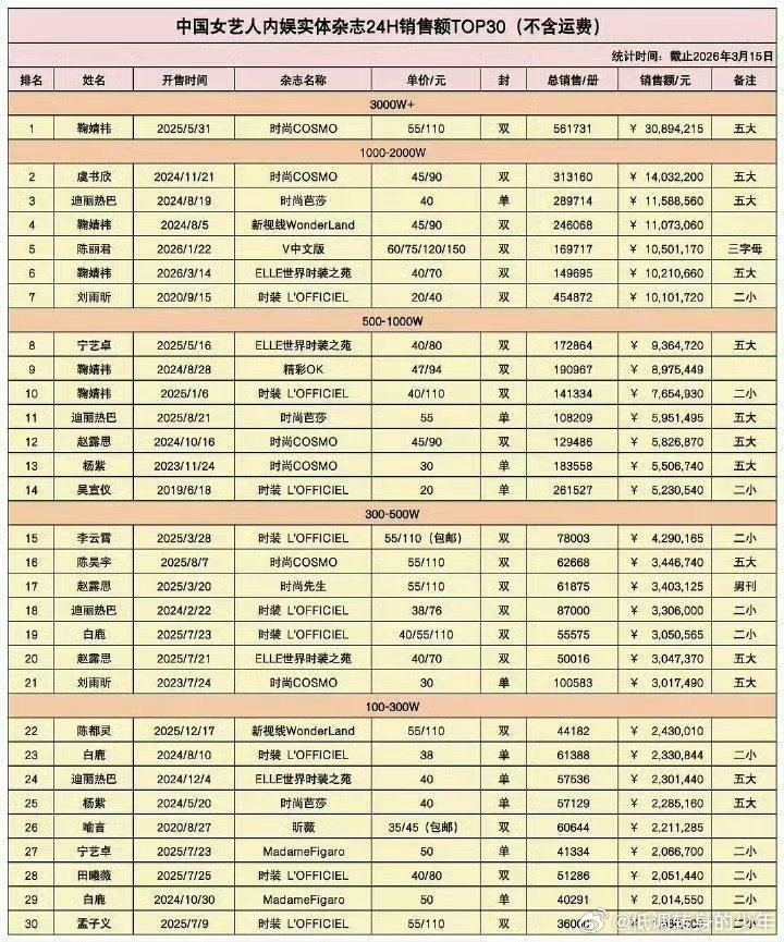 鞠婧祎杂志刷新最高纪录女星24小时杂志销量最新表格出炉~鞠婧祎杂志开售14小时