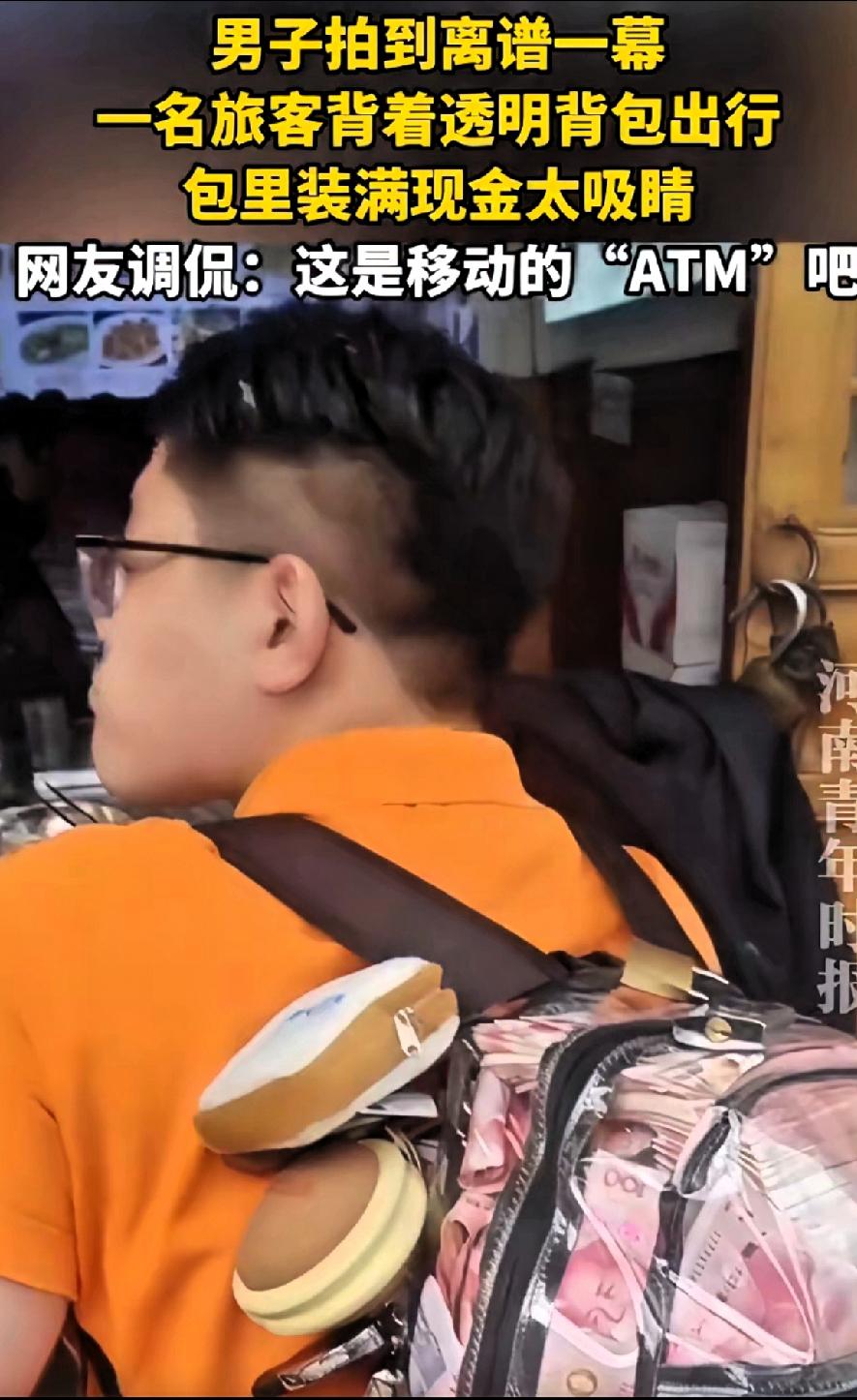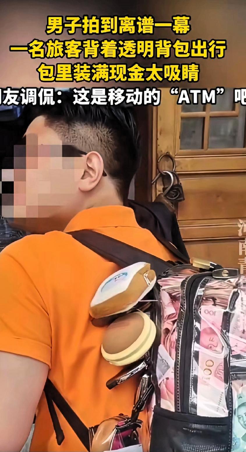 这般出行为哪桩? 3月13日,男子在热闹的商圈里看到了离谱一幕,一名穿着橙色上衣的小伙背着一个全透明背包,包身还特意加了一把沉甸甸的密码锁,在人群中格外扎眼。透明背包里,一沓沓百元大钞整整齐齐地堆叠着,几乎将整个背包撑得满满当当,红色的纸币纹路在光线下清晰可见,连捆扎的纸条都隐约可见。 有人调侃:这哪是背包,这分明是行走的ATM,也不知道这位小伙子是何目的?现在别说是年轻人了,就是老人也很少拿现金了,大家都是用手机支付,又安全又方便,他背这么多现金不害怕吗?大家认为呢?