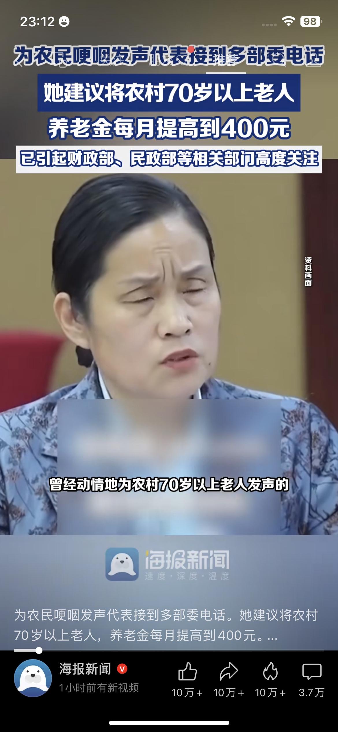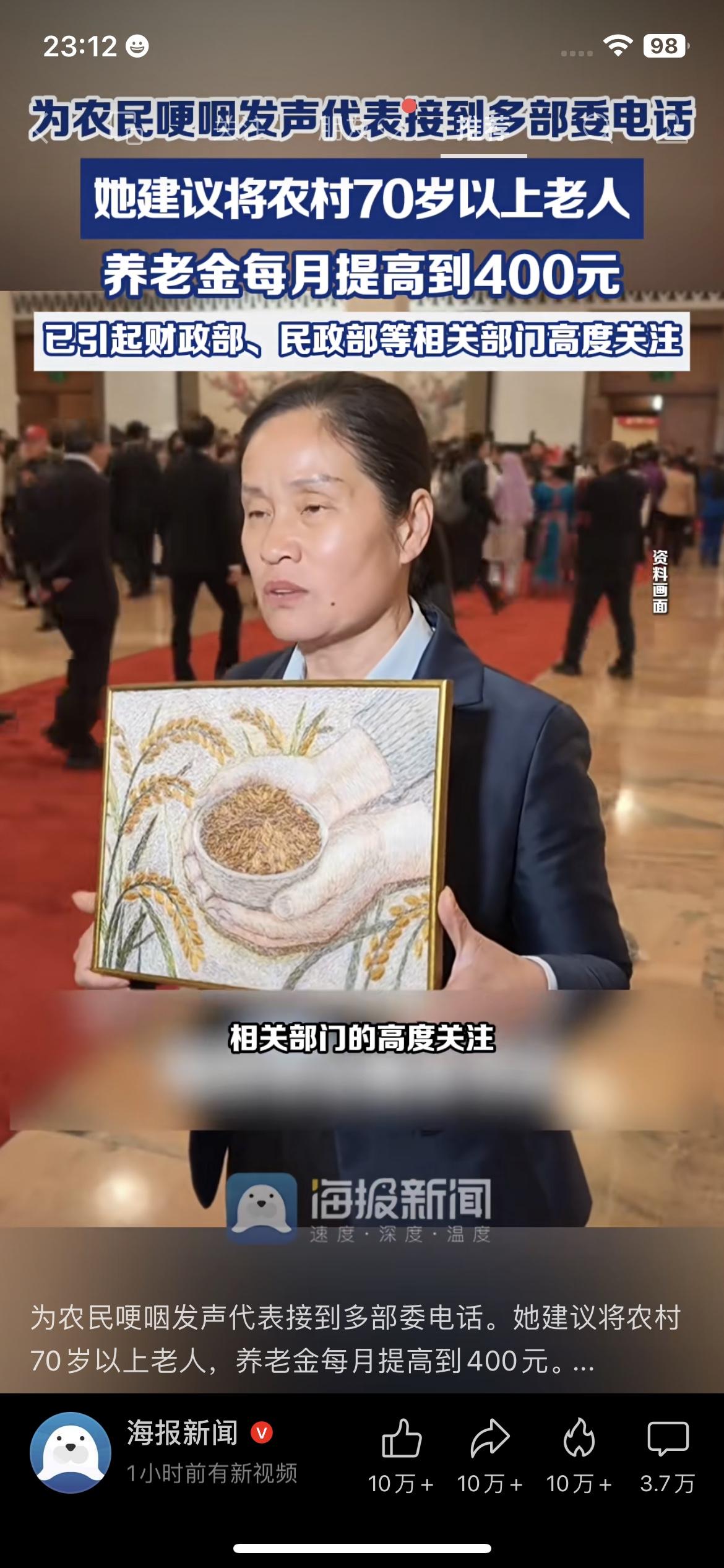 别再让农村老人难养老!代表哽咽发声,建议将70岁以上老人养老金提至400元。 这位代表在会上红着眼说,现在很多农村70岁以上老人,每月只有一百多块养老金,连吃饭吃药都紧巴巴,建议提到400块。这个建议已经引起财政部、民政部高度关注。 我老家就有这样的老人,一辈子种地,没职工社保,老了就靠这点钱过日子。对城里人来说,200多块可能就是一顿饭钱,但对他们来说,就是能多买几斤米、几盒药,能活得更体面。 这才是真正暖到老百姓心坎里的建议,盼着能早点落地。 农村养老 养老金 民生红利