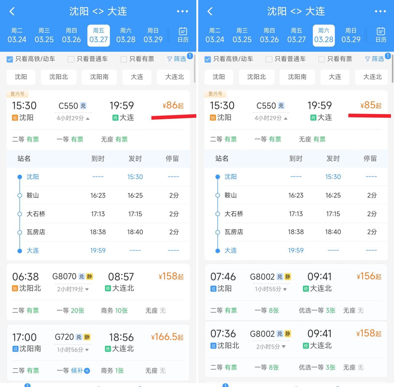 还是要提前祝贺沈阳,从3月28日起沈阳到大连的C550次列车将从86元降为85元,这样的话沈阳百姓到大连能节省1元钱。 更难得的是这趟列车采用的是复兴号车体,沈阳人到鞍山会很方便经停的是鞍山站,而不是偏远的鞍山西站,这让人倍感欣慰。 美中不足之处就是沈白高铁每公里票价确实有点高,每次从沈阳到通化、长白山让人深有感触,如果今后价格能有所下降对于沈阳来说可谓是受益匪浅。