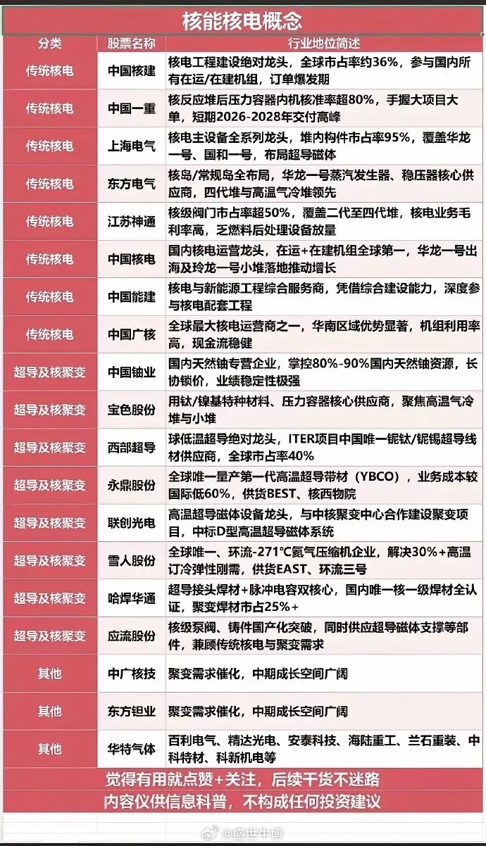 整理了一份核能核电核心标的清单,按赛道分类一目了然: