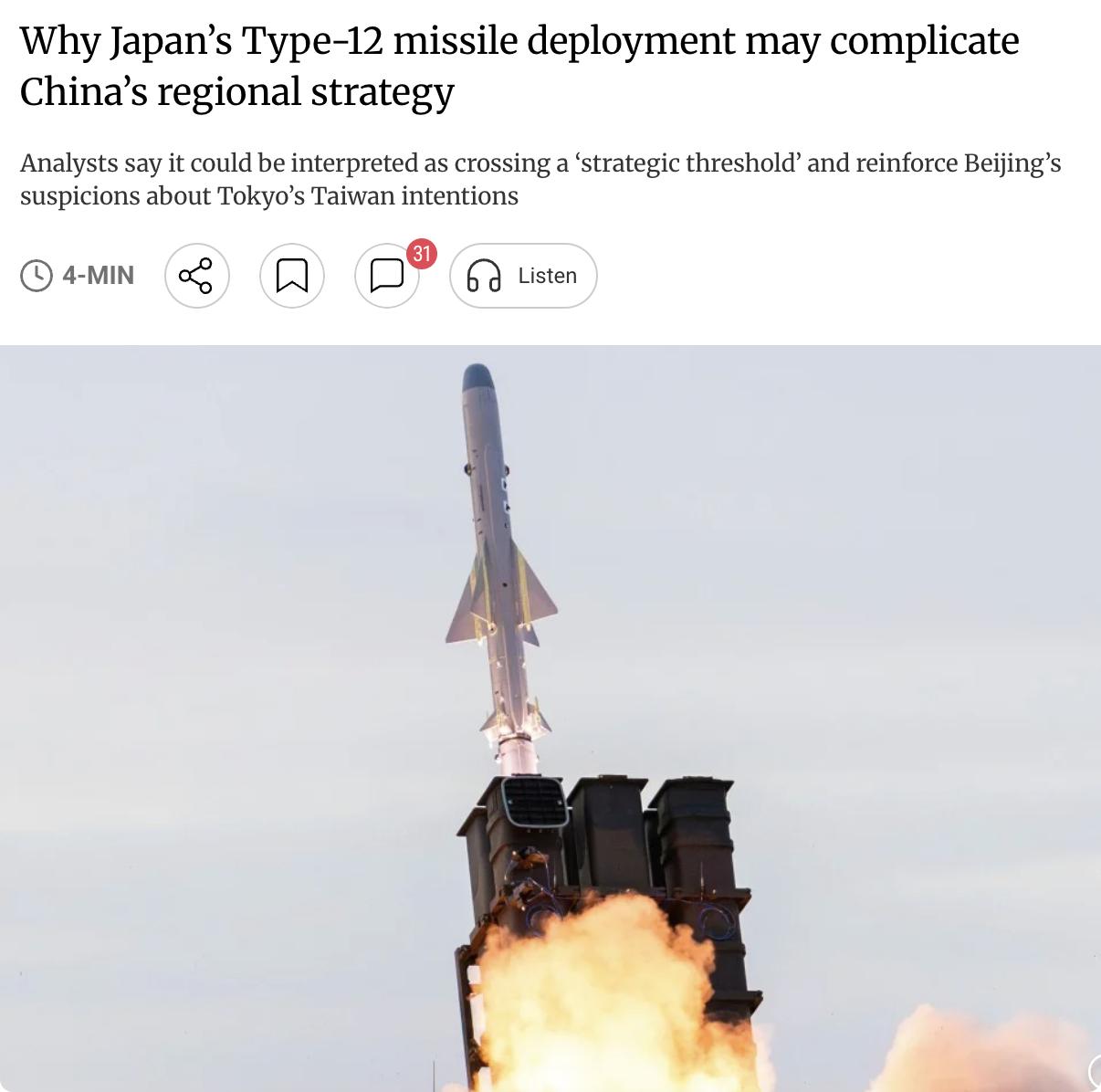 外媒:日本在九州部署远程12式导弹 日本内阁官房长官木原稔本周一宣布,升级版12式地对舰导弹将于本月底前部署至九州西南部熊本县健军营地。据报道,首批导弹发射车已于周一深夜抵达。此次部署较原计划提前一年,源于日本国防省2024年的调整决定。 升级版12式导弹由三菱重工研发生产,射程从原先的200公里大幅扩展至约1000公里,足以覆盖东海及台湾海峡关键区域。 分析人士指出,此举可能被中国解读为跨越"战略门槛",并强化中国对日本在台湾问题上真实意图的疑虑。