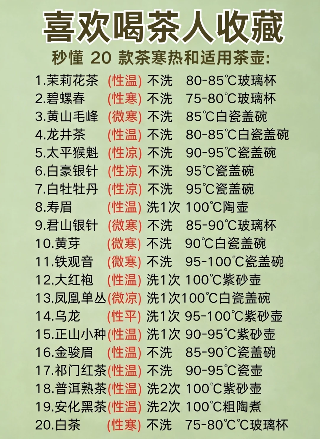 1. 茉莉花茶:性子温温的,完全不用洗茶,水温控制在80-85℃,用透明玻璃杯泡,颜值高还能喝到清甜花香。