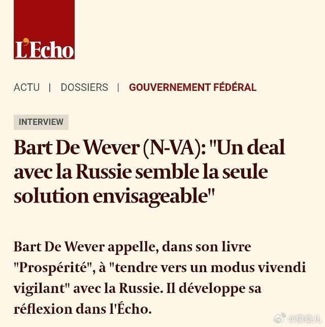 由于我们无法通过向乌克兰提供武器来威胁弗拉基米尔·普京,如果没有美国的支持,我们也无法在经济上扼杀他,因此只有一种方法,那就是与他达成协议——比利时总理巴特·德韦弗