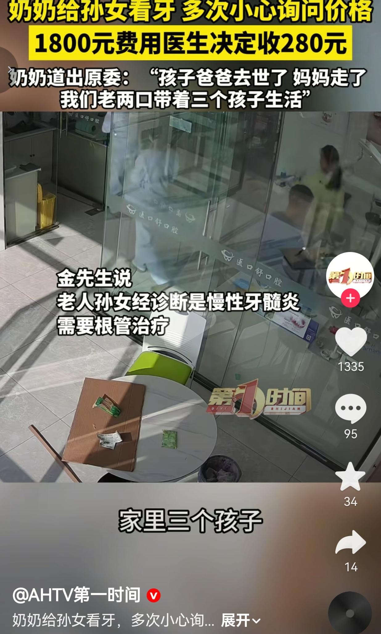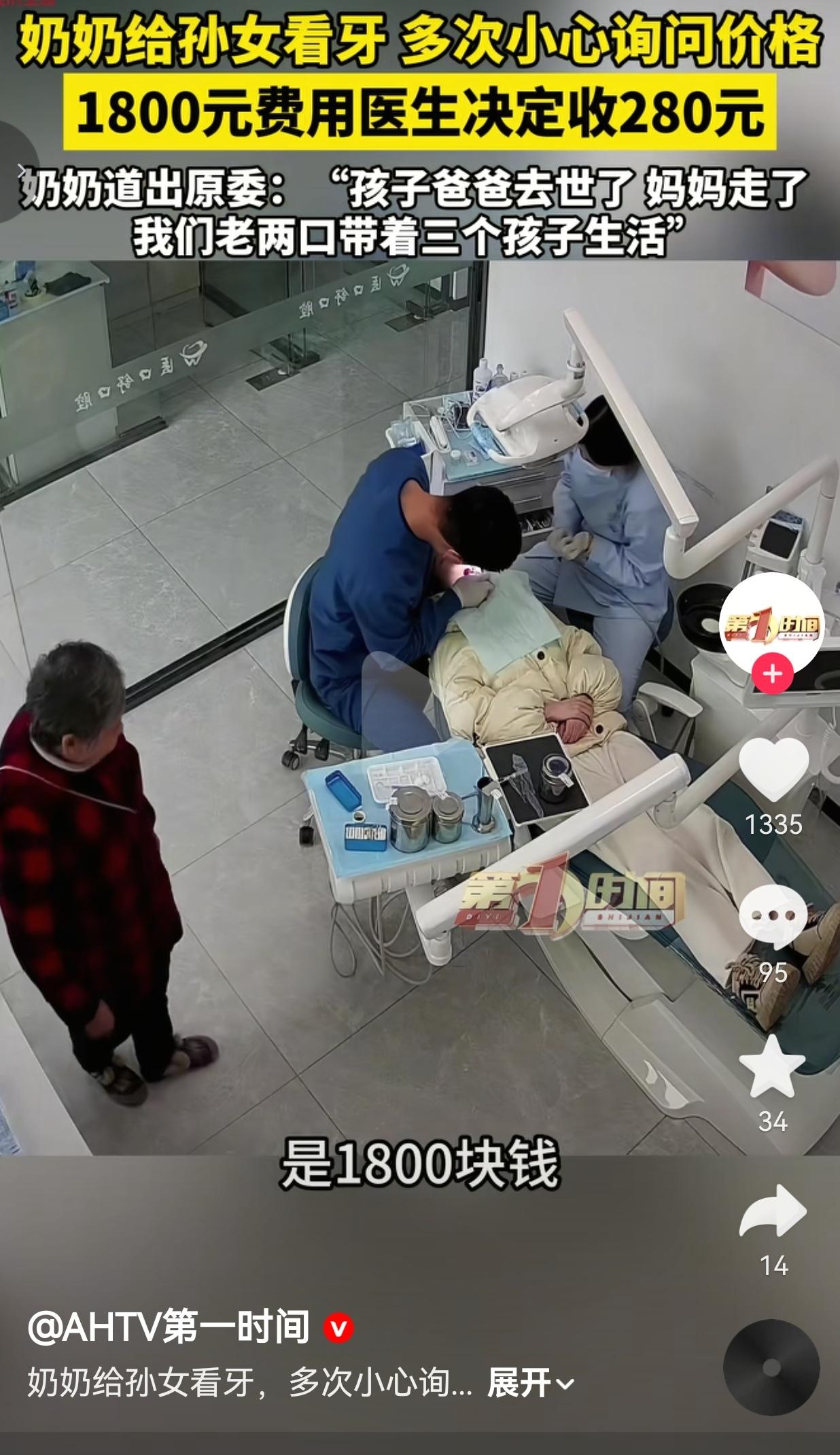 江苏连云港,3月15号,一个穿红黑格子袄的老太太,攥着皱巴巴的塑料袋,在口腔诊所门口徘徊了快半小时。 她不敢推门,怕问价——孙女牙疼得直哭,可她兜里的钱,连给三个娃买馒头都要算着花。 终于,她挪进诊所,声音抖得像秋风里的树叶:“大夫,我孙女牙疼……能不能先看看,多少钱我慢慢凑……” 医生金先生给孩子做了检查,慢性牙髓炎,得做根管治疗+牙冠,市场价整整1800块,全包在内。 老太太听完,脸瞬间白了,嘴唇哆嗦着说:“孩子爸走了,妈三年前也跑了,三个娃全靠我和老头子种地养活……1800,我真拿不出来啊……” 她没哭,可那佝偻的背、攥得发白的手指,比哭还让人心疼——这哪是问价,这是在求一条能让孙女少疼点的路。 金先生看着老太太,又看看躺椅上疼得缩成一团的小女孩,没多废话,直接说:“大娘,您带孩子过来治,280块,最低价了,根管+牙冠所有治疗费用,全包含在内,剩下的我来担。” 第二天,老太太真把孙女带来了,治疗全程,她就站在诊室门口,攥着衣角,眼睛一眨不眨盯着孩子,生怕哪一步又要加钱。 治疗结束,金先生只收了280块,连耗材钱都没算够。 后来有人问他亏不亏,他说:“啥亏不亏的,孩子没爹妈已经够苦了,咱不能再让钱把孩子的疼堵死。” 网友看到后评论说:“看哭了!我也带俩娃,知道养孩子有多难!没爹没妈的娃,连牙疼都不敢喊大声,太心疼了!” 也有的网友说:“凭什么普通人连看病都要算着活?1800块的治疗+牙冠,医生收280都不亏良心,那些动辄几万的检查费,到底赚的是谁的钱?” 还有的网友说:“最戳我的是奶奶站在诊室门口的样子!那是怕失去最后一点希望的模样,医生给的不是钱,是活下去的底气!”  我们总说“人间自有真情在”,可太多时候,我们被冰冷的现实磨平了棱角,忘了该怎么去共情,怎么去伸手帮一把。 这个奶奶的无助,这个医生的善意,像一束光,照进了我们麻木的生活——它告诉我们,这世上不是只有利益和算计,还有人在守着良知的底线;它告诉我们,面对苦难,我们可以选择冷漠,也可以选择伸出手;它更告诉我们,真正的文明,从来不是高楼大厦,而是不让一个孩子因为没钱,忍着疼哭到天亮! 钱可以少赚,但良心不能丢;规矩可以变通,但人性不能凉!这280块,是给孩子的止疼药,更是给这个世界的清醒剂! 对此,你怎么看?