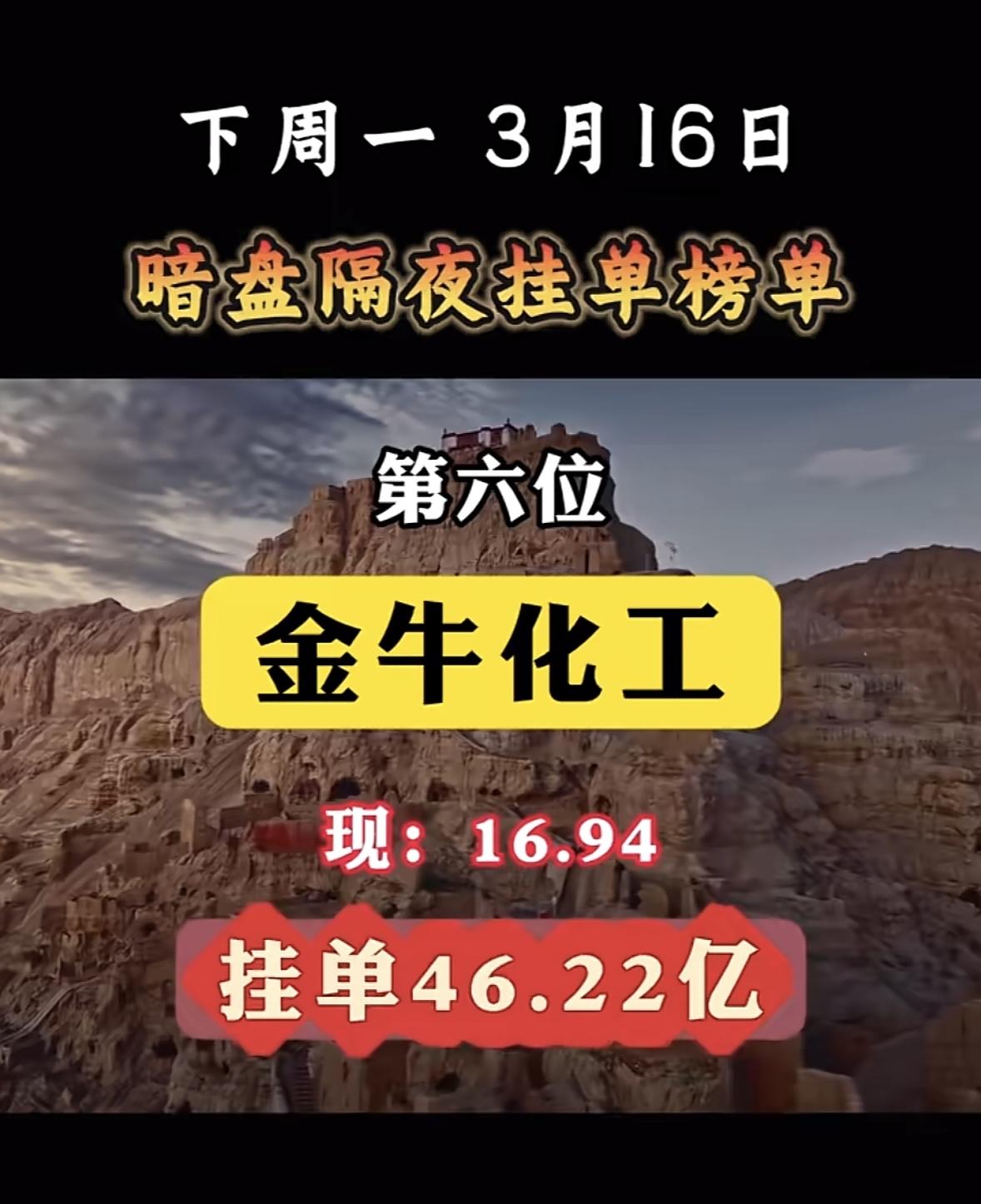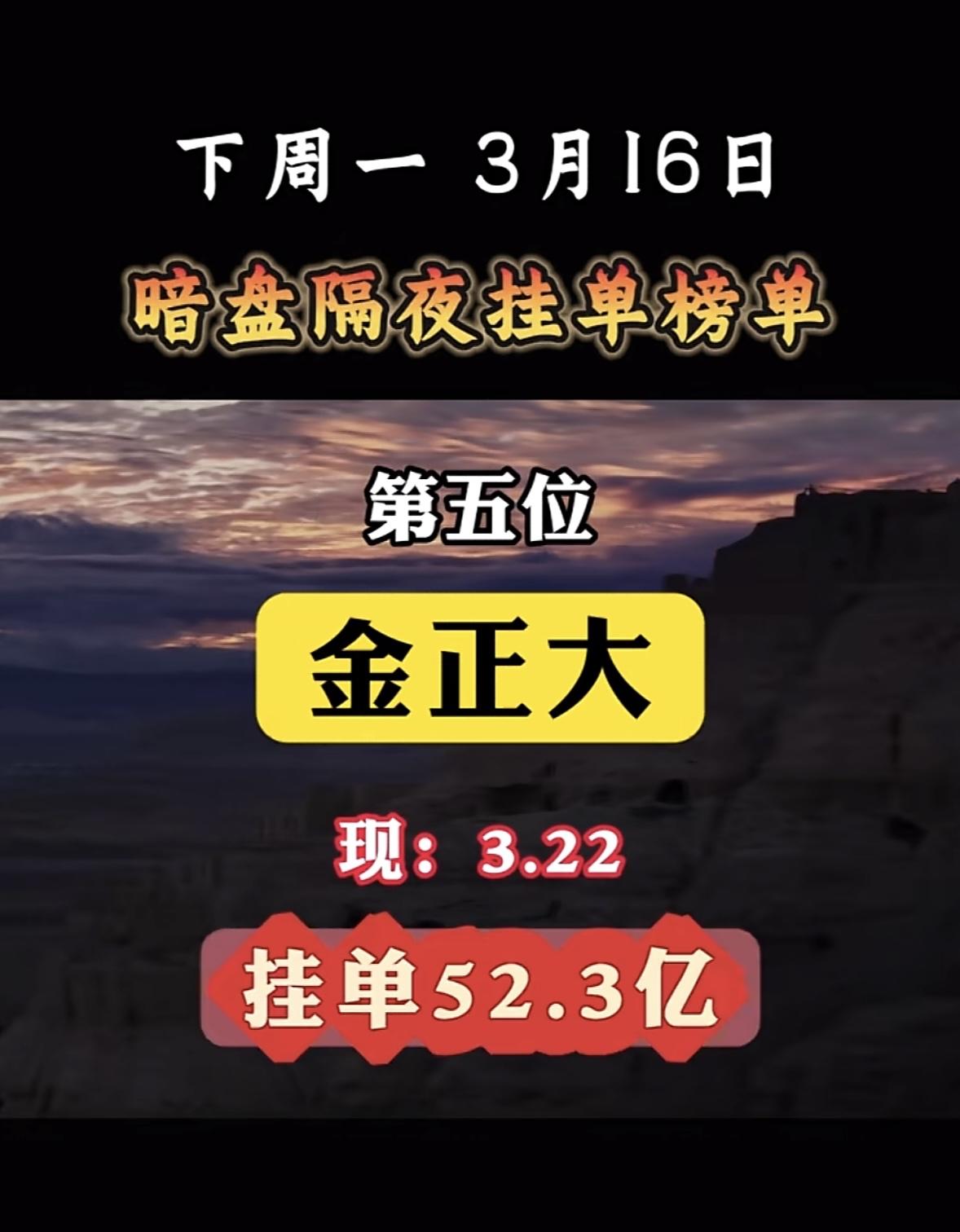 3月16日暗盘隔夜挂单揭晓 暗盘隔夜挂单榜单又有新情况!3月16日的榜单里,金正大位列第三,现价3.22,买单高达85.65亿,卖单22.89亿。和3月3日的榜单对比,变化还挺大。3月3日时,洲际油气以52.23亿挂单排第一,而金正大这次表现亮眼,买单金额远超之前榜单里靠前的公司。像3月3日排名第五的法尔胜,挂单才35.66亿,和金正大这次的85.65亿没法比。这榜单的变化或许暗示着市场风向的转变,金正大后续走势值得关注。
