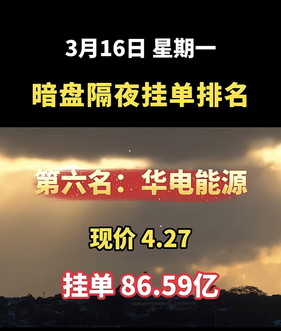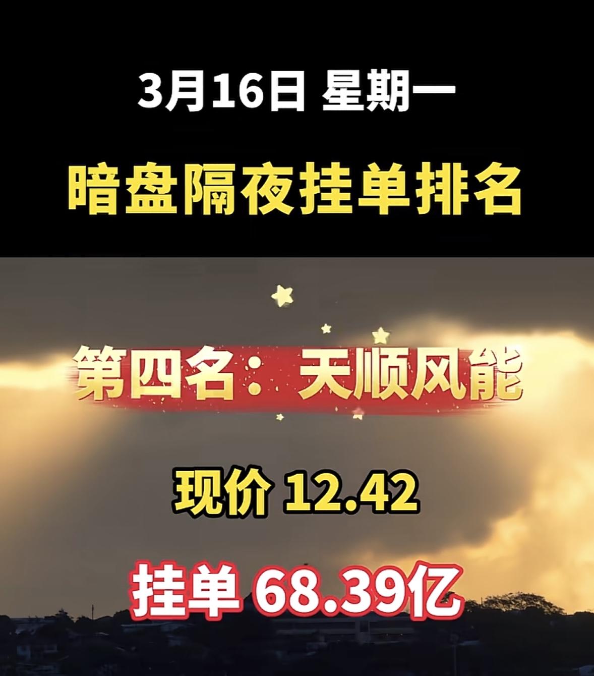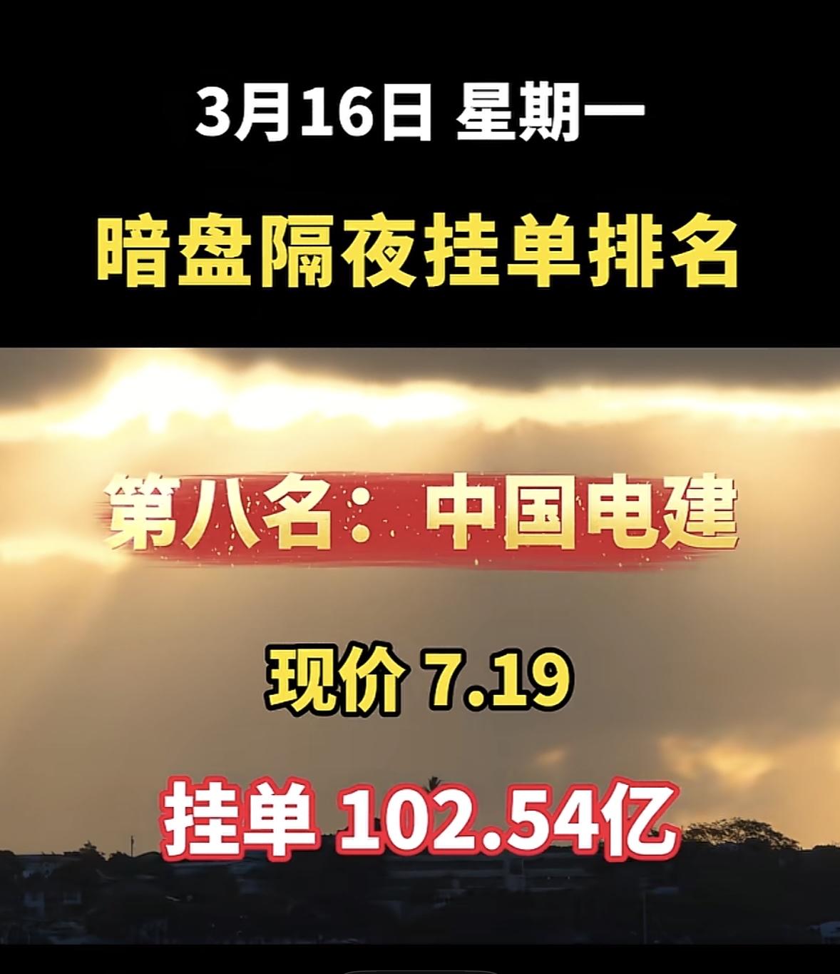 3月16日暗盘隔夜挂单有不少看点。 之前说中国电建暗盘隔夜挂单排名第八,现价7.19,挂单102.54亿。而最新的排名里它是第一名,现价7.29,买单达113.21亿。中国电建作为基建和电力工程领域重要参与者,业务覆盖新能源电力建设等热门板块,资金布局或许是看好基建和新能源协同发展。像金风科技也是资金关注对象,它是风电龙头,现价31.43元,虽离历史最高160元差距大,但当前行业发展势态好,资金关注体现对风电赛道前景看好。这些暗盘隔夜挂单数据,真藏着不少市场信号呢。