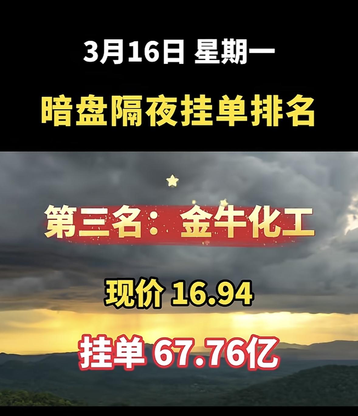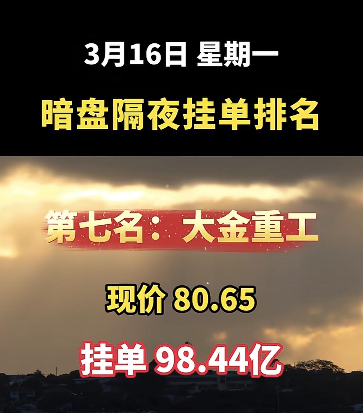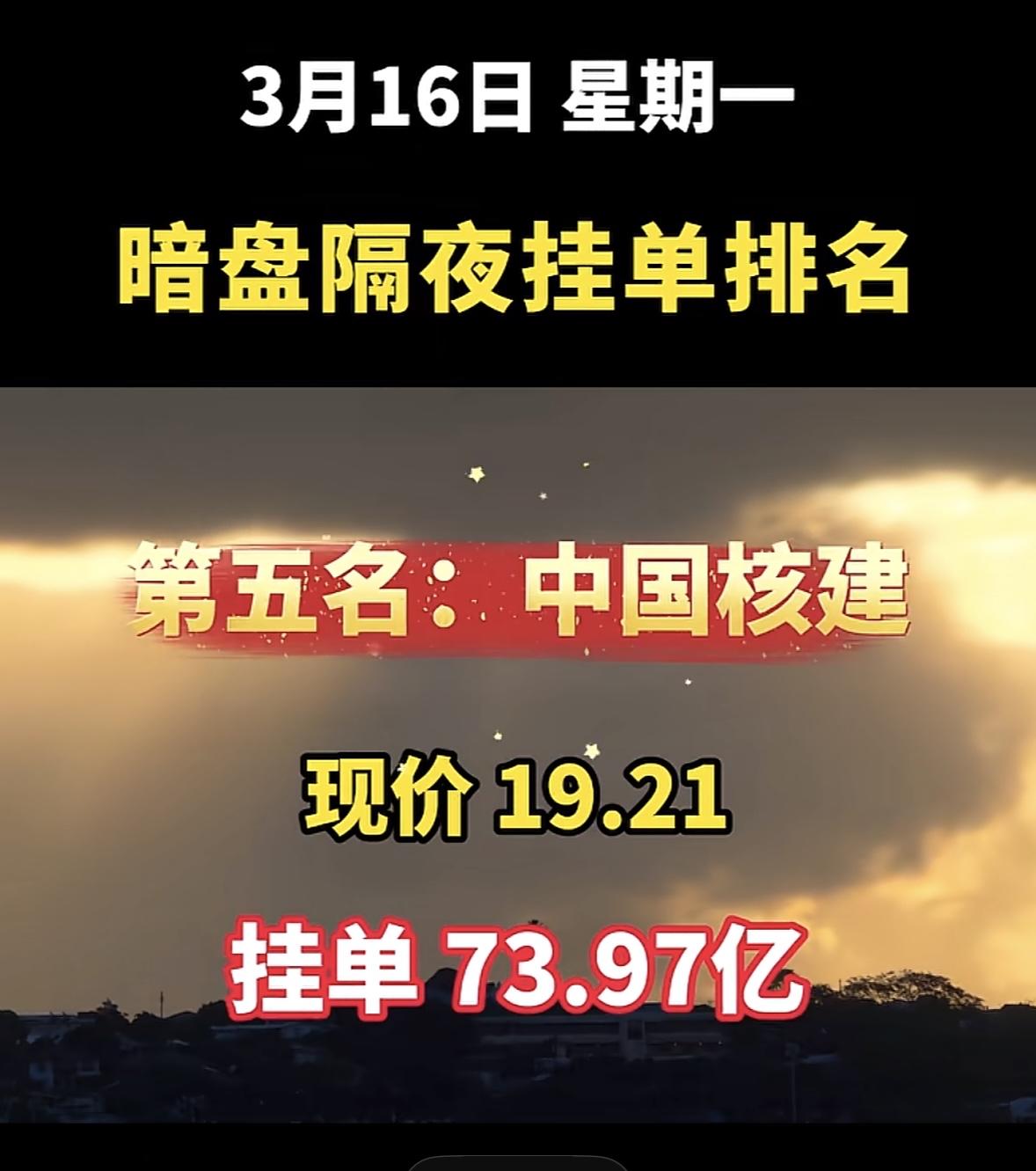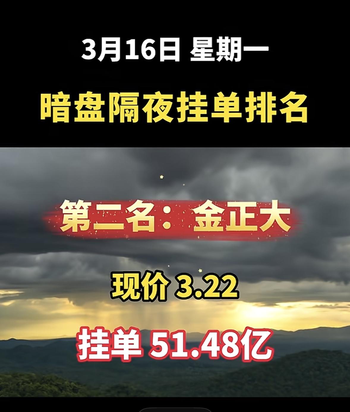 3月16日暗盘隔夜挂单有不少看点。 之前说中国电建暗盘隔夜挂单排名第八,现价7.19,挂单102.54亿。而最新的排名里它是第一名,现价7.29,买单达113.21亿。中国电建作为基建和电力工程领域重要参与者,业务覆盖新能源电力建设等热门板块,资金布局或许是看好基建和新能源协同发展。像金风科技也是资金关注对象,它是风电龙头,现价31.43元,虽离历史最高160元差距大,但当前行业发展势态好,资金关注体现对风电赛道前景看好。这些暗盘隔夜挂单数据,真藏着不少市场信号呢。