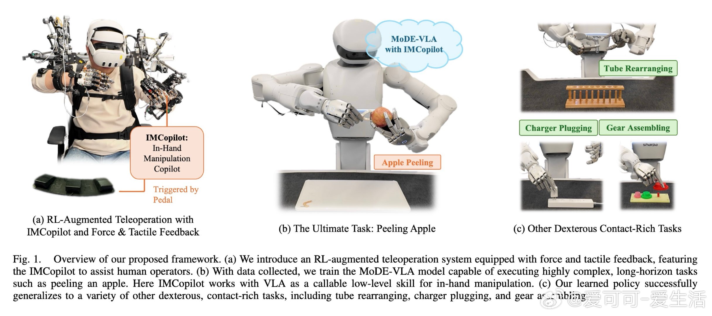 在灵巧操作领域,让机器人像人手一样执行"削苹果"这类接触密集型任务,是一个悬而未决的难题。现有 VLA 模型受困于低自由度夹爪范式,本质原因是:63 自由度双臂系统的遥操作数据采集几乎超出人类上限,力觉/触觉模态与视觉语言表征存在物理语义鸿沟,单一策略无力跨越从抓取到手内操作的技能断层。