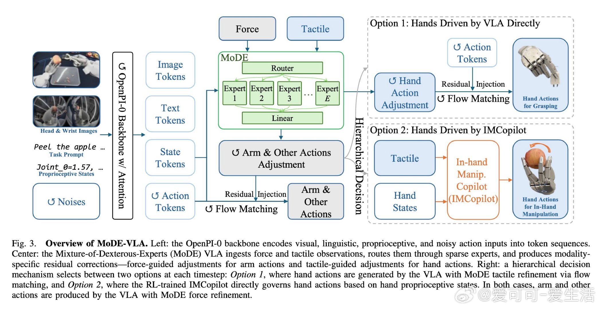 本文的核心洞见是:把"手内旋转"这一人类难以示教的技能,重新看作可被 RL 预训练并按需调用的原子原语。由此,IMCopilot 在采集阶段由脚踏板触发替代操作员完成难操作段,在推理阶段由 VLA 输出触发信号直接接管手部控制;同时,MoDE 模块将臂力矩与指尖触觉分别路由至专属稀疏专家,以残差注入方式叠加在预训练骨干之上,使接触感知修正不污染已有知识。