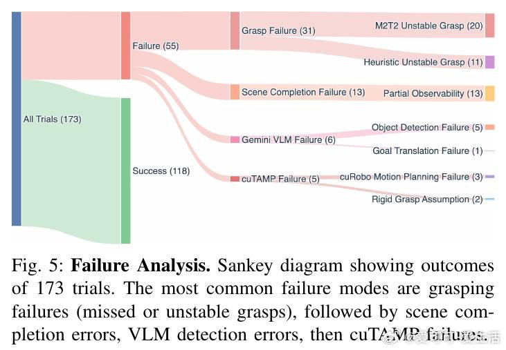 这项工作真正留下的遗产是:证明了拼装现成基础模型加规划算法,足以在语义理解、干扰物排除、多步序列任务上与经过350小时专属数据微调的VLA模型比肩乃至超越。它为后来者打开的新门是:模块化架构天然支持组件级故障溯源与独立升级,为规划与学习的深度融合提供了可操作的实验平台。但尚未跨过的门槛是:开环执行使抓取失败后无法自我纠正,这是当前最主要的失效瓶颈,占所有失败案例的逾半数。