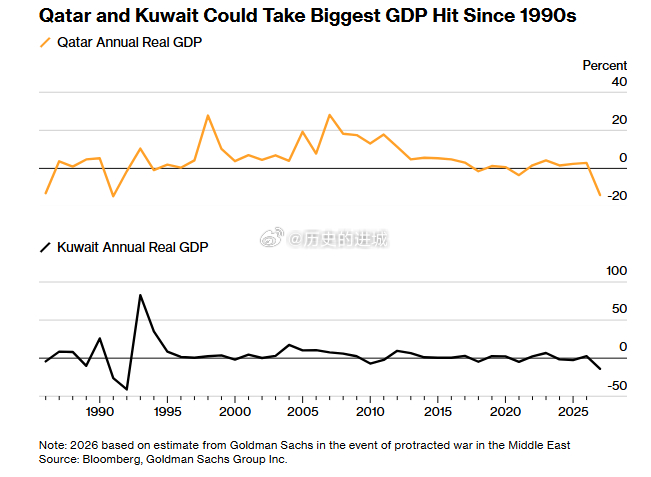 高盛经济学家法鲁克 · 苏萨表示,如果冲突持续到 4 月,并导致霍尔木兹海峡停运两个月,卡塔尔和科威特今年的国内生产总值可能各自萎缩 14%。