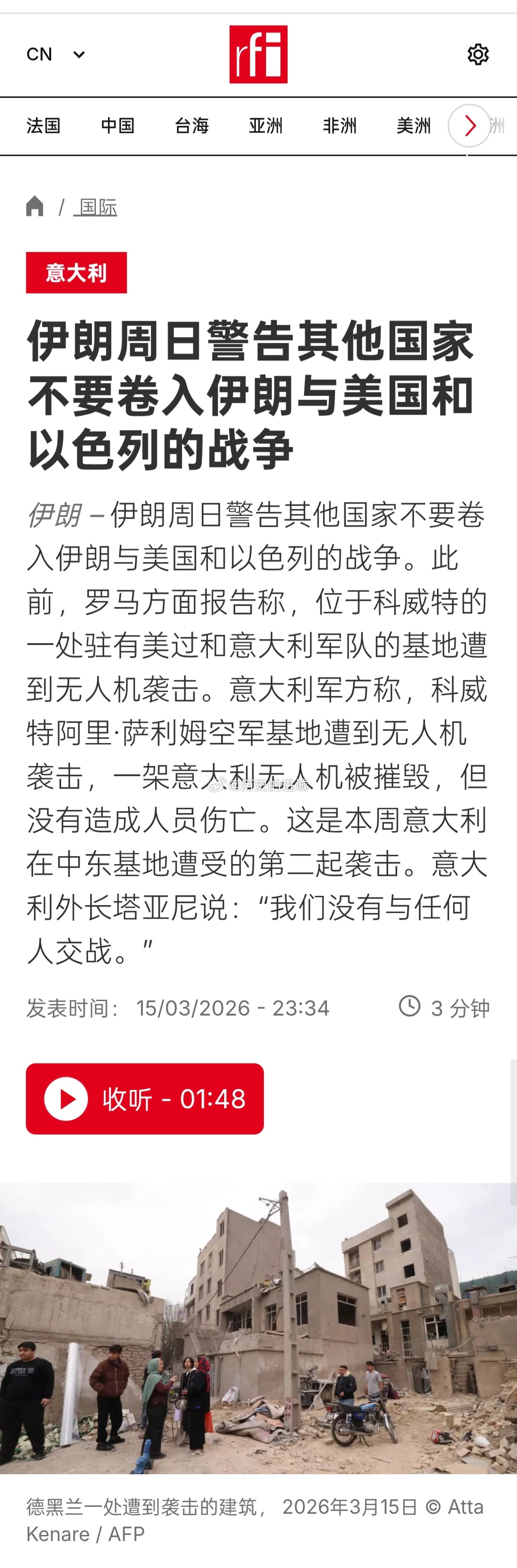 伊朗发射泥石弹道导弹伊朗周日警告其他国家不要卷入伊朗与美国和以色列的战争。此前,罗马方面报告称,位于科威特的一处驻有美国和意大利军队的基地遭到无人机袭击。意大利外长塔亚尼说:“我们没有与任何人交战。”