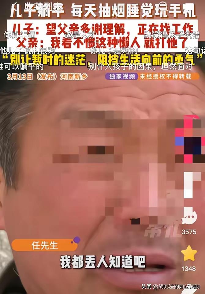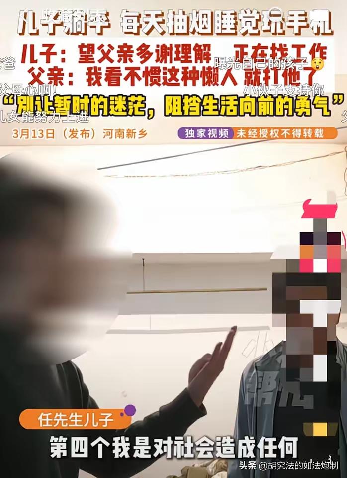 25 岁大学生在家躺平,父亲求助记者反被“灵魂三问”怼懵:我懒违法吗? “我承认我有点懒,可这样违法吗?”“我选择躺平,违背公序良俗了吗?” “我麻烦别人、影响社会了吗?” 当这三句逻辑严密、振振有词的“灵魂拷问”从一位 25 岁大学毕业生的口中蹦出来时,就连见惯了各种家庭纠纷的资深记者,一时间竟也被怼得哑口无言,现场空气仿佛瞬间凝固。这并非什么辩论赛现场,而是发生在河南新乡的一幕真实家庭闹剧。 故事的主人公是任先生和他那刚毕业不久的儿子。任先生是个典型的老实巴交的中国父亲,半辈子省吃俭用,哪怕家里条件捉襟见肘,也要咬碎牙关供儿子上大学。在他朴素的价值观里,“知识改变命运”是铁律,只要孩子读了书,将来总能有个好前程,自己再苦再累也值了。然而,现实却给了这位老父亲一记响亮的耳光。 儿子大学毕业回到家,非但没有像邻居孩子那样忙着投简历、跑面试,反而开启了“终极宅男”模式。每天日上三竿才起床,头发乱如鸡窝,黑眼圈深重,整个人散发着一种颓废的气息。醒着的时候,左手香烟右手手机,烟雾缭绕中仿佛与世隔绝。起初,任先生还安慰自己:孩子刚毕业,压力大,让他歇歇也好。可这一歇,就是一个多月。看着儿子日益萎靡的状态,任先生心里的火越烧越旺。他不怕儿子花钱,怕的是儿子废了!人活一张脸,树活一张皮,年纪轻轻就大门不出二门不迈,传出去不仅名声臭了,以后谁家的姑娘敢嫁进来? 焦虑转化为愤怒,任先生终于忍不住开口唠叨了几句。谁知这一开口,直接点燃了父子间的炸药桶。早已不是孩童的儿子,对父亲的“陈词滥调”极度反感,几句顶撞后,情绪失控的任先生动了手。这一打,彻底打碎了父子间最后的温情,儿子索性彻底“躺平”,连话都不愿多说一句。 走投无路的任先生,只能求助媒体,希望记者能帮忙劝劝这个“不成器”的儿子。谁能想到,记者刚一进门,还没来得及展开温情攻势,就被小伙子劈头盖脸的“三连问”给整不会了。这三句话,看似有理有据,实则冷酷无情,将“啃老”包装成了“个人自由”,把“不孝”美化成了“不违法”。 面对小伙子的强词夺理,我们不禁要问:法律确实是道德的底线,但难道人生的标准就仅仅是不违法吗?《民法典》第二十六条写得清清楚楚:“成年子女对父母负有赡养、扶助和保护的义务。”你已年满 25 周岁,早已过了被抚养的年纪。你口中的“没影响他人”,真的成立吗? 你吃的每一口饭,用的是父母弯下脊梁换来的血汗钱;你抽的每一根烟,烧的是父母省吃俭用攒下的养老本;你用的每一度电、每一滴水,哪一样不是父母在承担?你说没麻烦别人,可你最亲的父母,正因为你而日夜煎熬、以泪洗面,这难道不是最大的伤害?这种理直气壮的“厚颜无耻”,恰恰暴露了某些高学历低德行者的巨婴心态。 一个人可以暂时没有工作,可以迷茫,但绝不能没有感恩之心,不能丧失奋斗的勇气。父母托举你长大,不是为了让你在他们年老时,还要继续弯着腰为你遮风挡雨,甚至成为你逃避现实的温床。所谓的“躺平”,在不具备独立生存能力的前提下,本质上就是对他人的掠夺,尤其是对深爱你的父母的残酷剥削。 好在,经过记者一番入情入理的剖析,戳破了小伙子那层自私的逻辑外壳,他终于低下了高傲的头颅,意识到了自己的荒唐,承诺会走出家门,积极寻找工作。这场风波看似平息,却留给无数家庭深深的思考。 在这个竞争激烈的时代,年轻人压力大是事实,但这绝不是逃避责任、啃老赖活的借口。真正的成熟,不是用法律条文来为自己的懒惰辩护,而是勇于扛起生活的重担,懂得体谅父母的不易。愿每一个“躺平”的青年都能早日醒悟:家是用来爱的港湾,不是用来挥霍的旅馆;父母是用来孝敬的亲人,不是无限提款的 ATM 机。莫让“孝顺”二字,成了这个时代最稀缺的奢侈品。大龄孩子躺平 娃卷家务我躺平