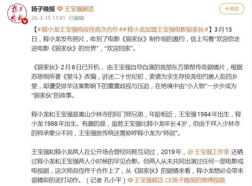 释小龙王宝强终于合作了! 3月15日,释小龙晒出电影邀约信,正式官宣加盟王宝强自导自演的新片《狠家伙》。这对相识超30年的嵩山少林同门,终于迎来了首次银幕合作! 最有意思的还是那个辈分梗:王宝强比释小龙大4岁,可按少林寺的师承辈分,他得规规矩矩叫释小龙一声师叔。 两人早年就晒过童年练功的合影,交情不浅,却从没正经同框演过一部戏,这次合作直接圆了影迷多年的遗憾。 这部《狠家伙》2月就已开机,改编自《堂斗》,是王宝强首部东方黑帮传奇片,主打硬核动作戏。 释小龙扎实的真功夫刚好适配影片的硬派风格,两个少林出身的实力派凑一起,这打戏质感直接拉满,太让人期待了!