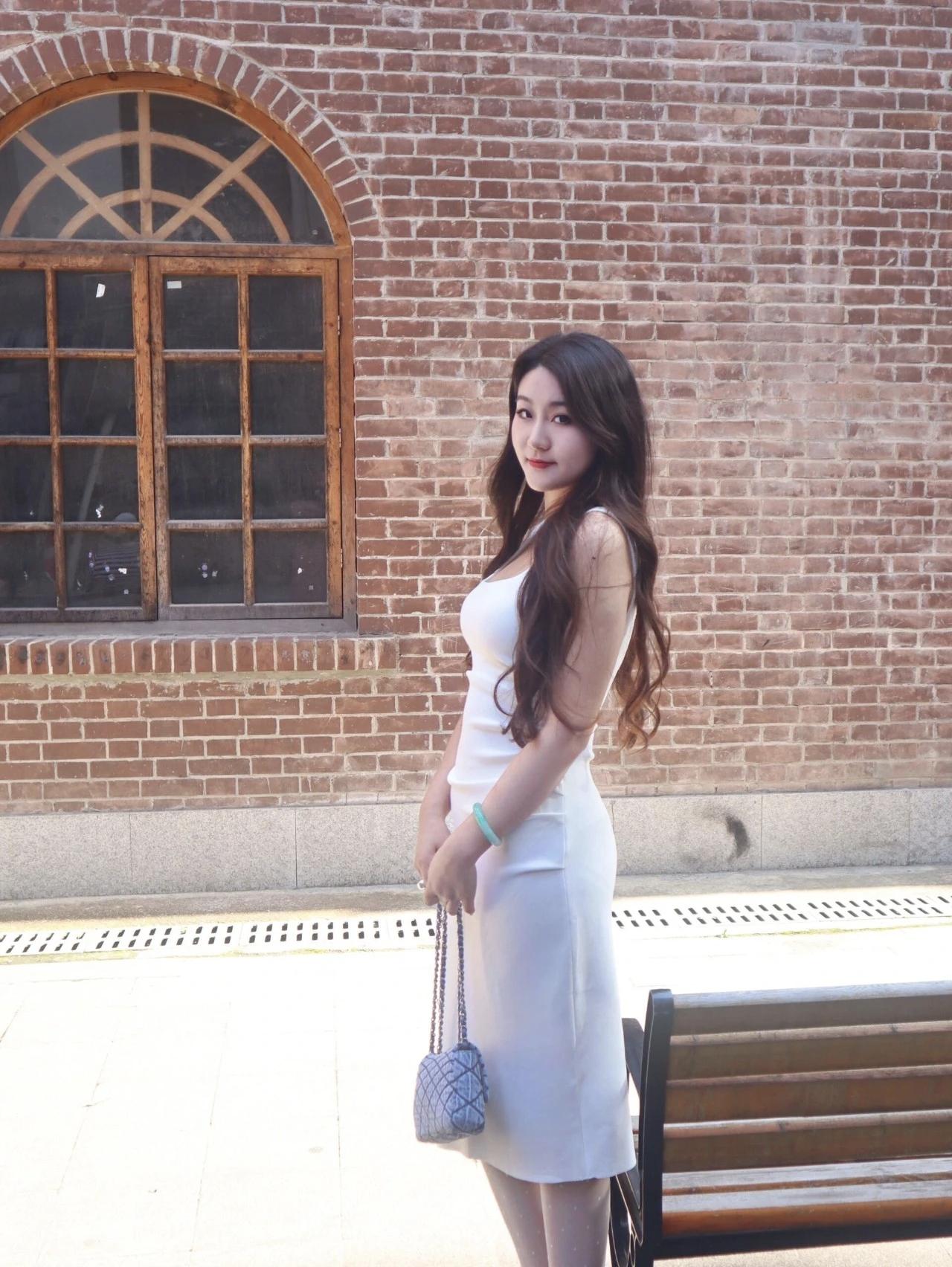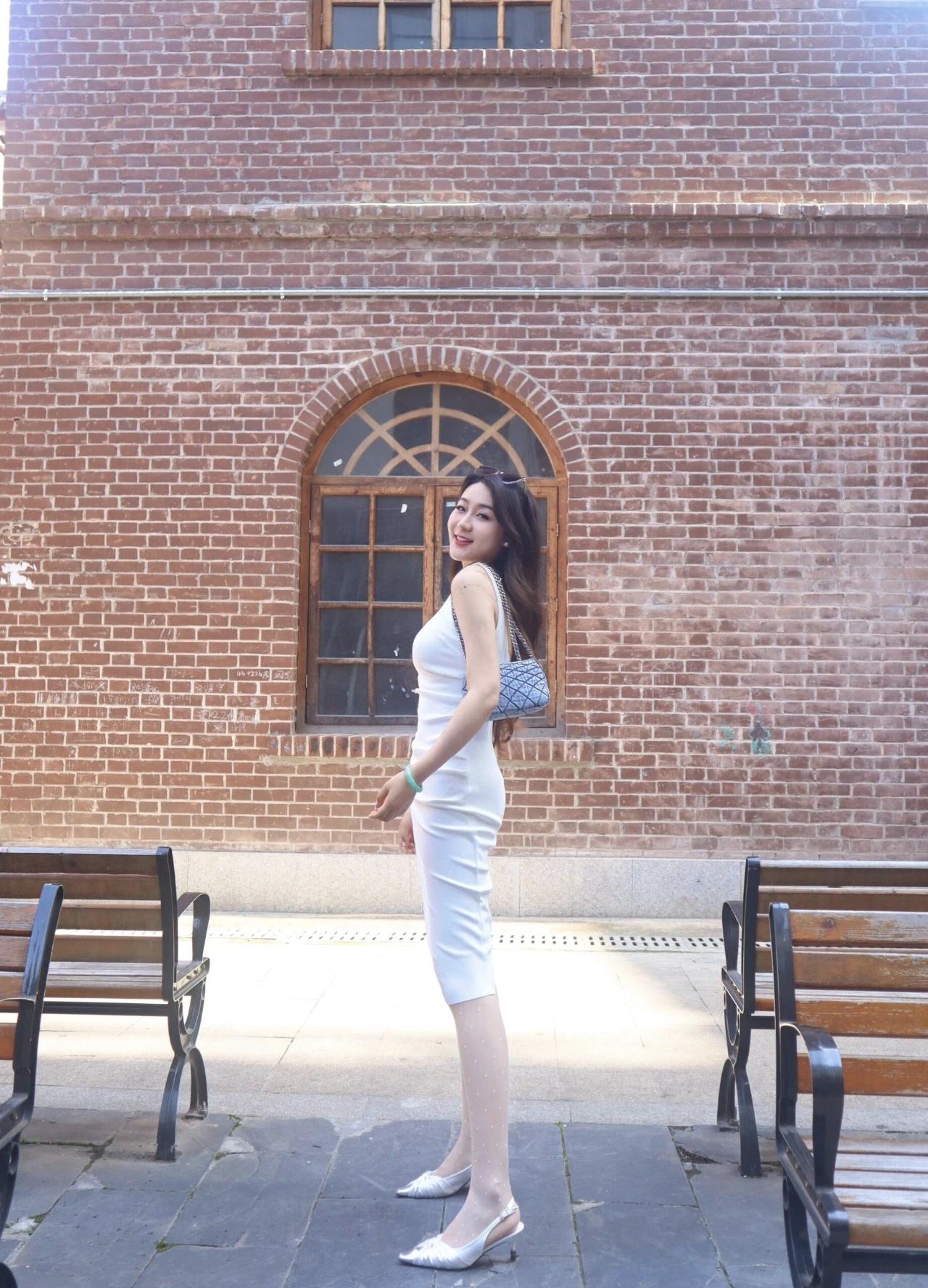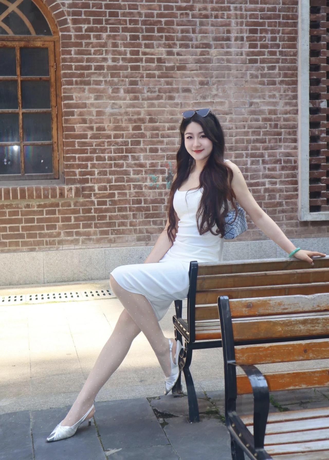 夏日清新穿搭,白色连衣裙搭配高跟鞋,坐在木椅上,阳光洒落,轻松自在。