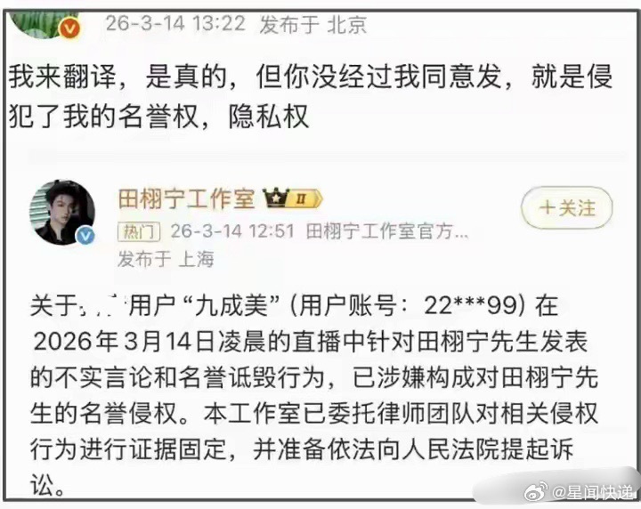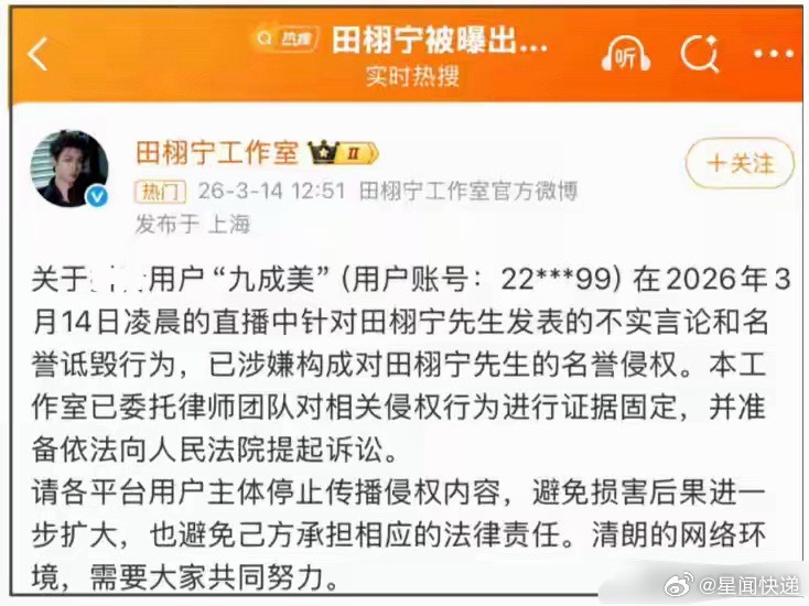 田栩宁曾因《逆爱》爆红,此前多次胜诉造谣案。吃瓜需谨慎,无实锤勿乱转!九成美坐实田栩宁孕期出轨