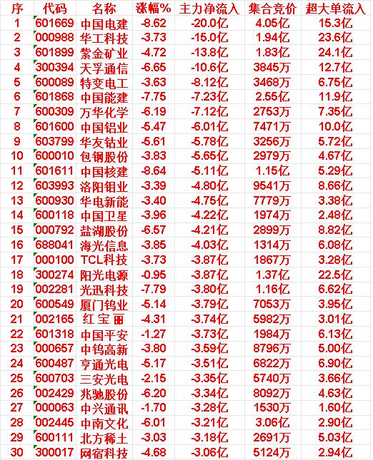 3月16日上午盘,主力趁低位,大幅买入的30名单 中油资本:涨幅10.02%,主力净流入9.08亿 贵州茅台:涨幅2.92%,主力净流入8.76亿 比亚迪:涨幅3.59%,主力净流入8.20亿 兆易创新:涨幅4.01%,主力净流入7.72亿 顺钠股份:涨幅10.02%,主力净流入6.70亿 3月16日中午收盘,主力资金“大幅卖出”的30名单: 中国电建:涨幅-8.62%,主力净流入-20.0亿 华工科技:涨幅-3.73%,主力净流入-15.0亿 紫金矿业:涨幅-4.72%,主力净流入-13.8亿 天孚通信:涨幅-6.65%,主力净流入-10.6亿 特变电工:涨幅-3.63%,主力净流入-8.12亿