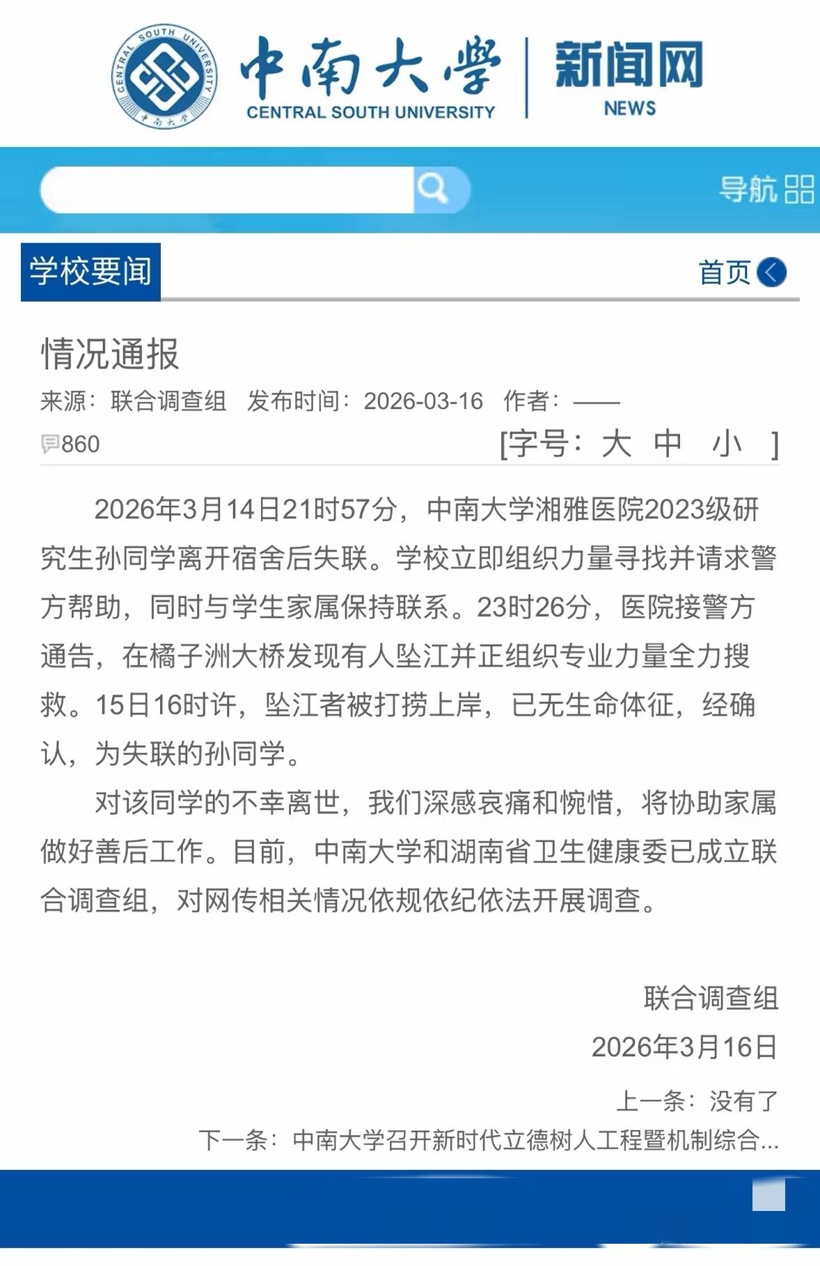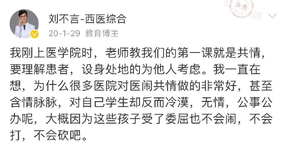 除了心痛还能做什么! 一名可造之材、如花似玉的女孩,就这样没了,这个世间从此少了一位会去拯救生命的天使!临走之前,朋友圈诉说了她生前所有的经历,字字戳心,除了不公就是被欺压! 很讽刺的是,刘不严说所有上医学院的第一课,就是要共情患者,理解患者,而对自己的学生却是如此刻薄,一度训斥,随意泄愤! 看得出这位女孩,是个善良温柔又有能力的人才,可惜没有遇到怜惜她的引路人!满屏都是不堪重负的琐碎工作,接不完的电话,不停地被训斥,压力就像无形之中黑压压的一双爪子,歇了就要随时把她拎起来去被消耗一样! 希望最后迎来的,不仅仅是一份冷冰冰的官方声明! 中南大学 中南大学湘雅医院