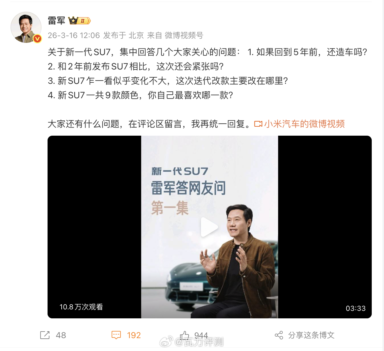 雷军称新SU7是经得起时间考验的好车
