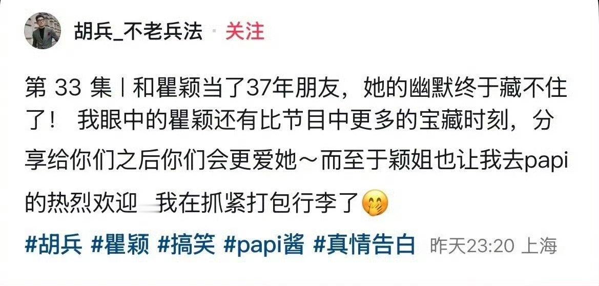 胡兵要去papi节目了 谁能不爱这种熟人局!瞿颖一喊胡兵就光速安排行程打包行李,这默契这速度,节目笑点稳了,期待值拉满!!