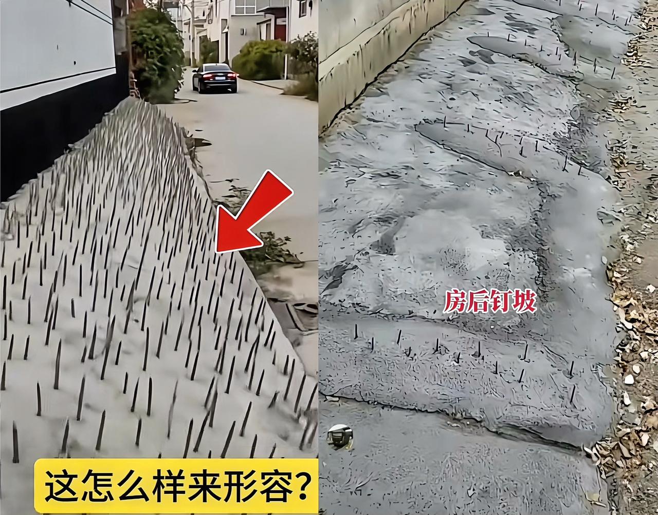 就怕别人压到地基,居然 在一两米的距离内插满了钉子, 那场面,密密麻麻的,光看