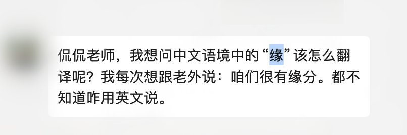 "缘分"实际上就是 fate 或 destiney(命运),"咱们很有缘分",英