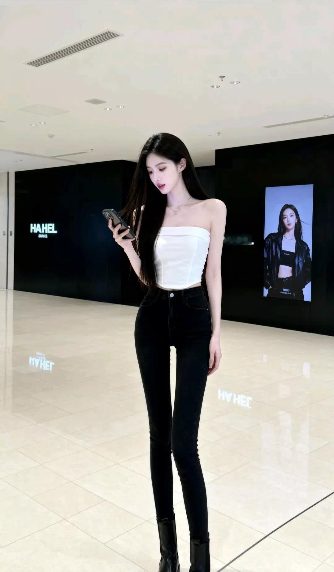 复古风穿搭,黑色紧身牛仔裤搭配长袖上衣,尽显时尚与优雅。
