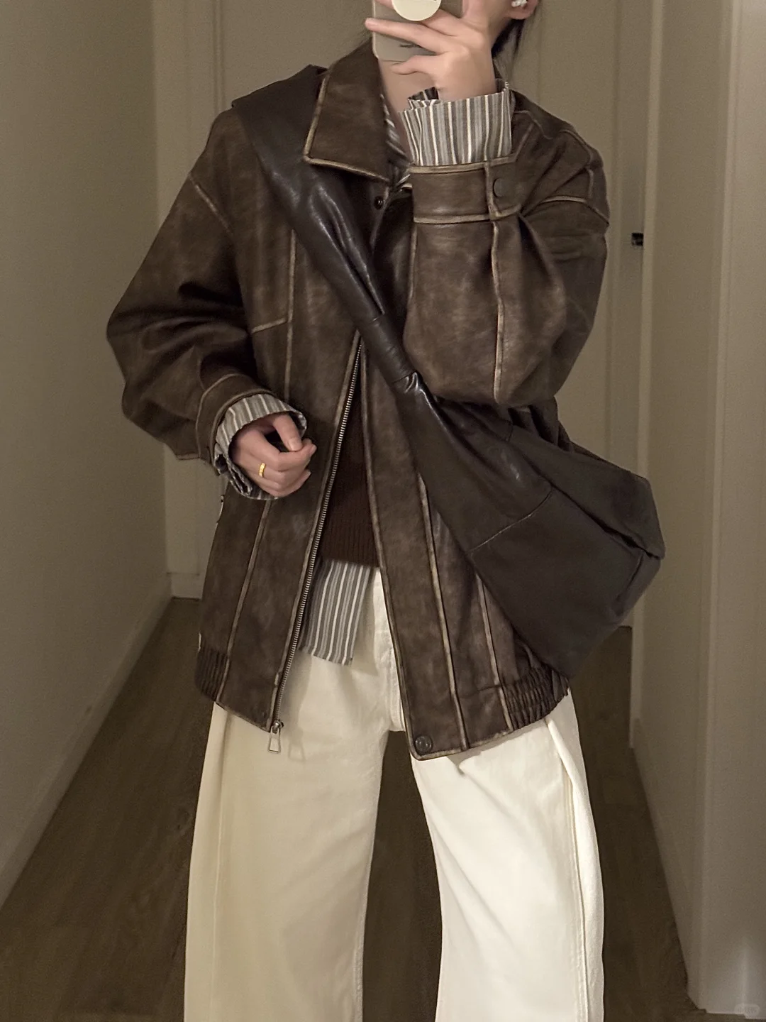 好秋冬韩系复古美拉德棕咖机车外套叠穿🍪