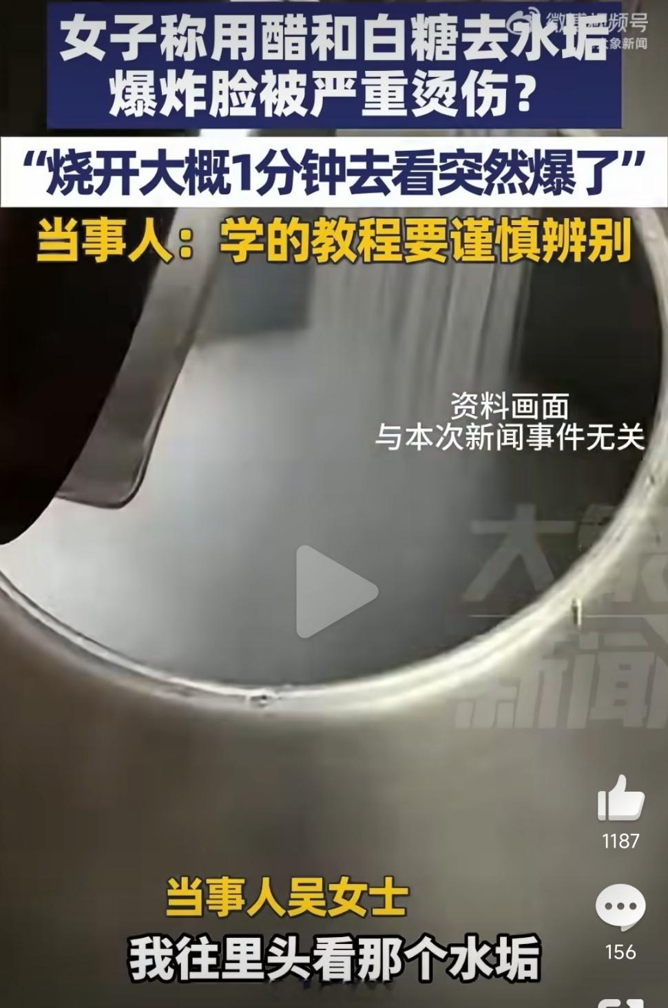 女子用醋和白糖烧水致爆炸烫伤女子受伤暴露出的“偏方依赖”值得深思。明明用白醋浸泡