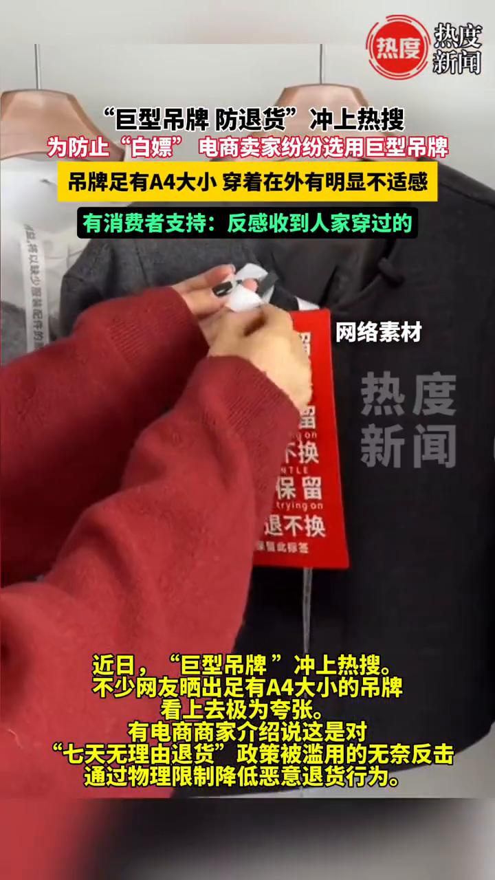 "巨型吊牌防退货"冲上热搜。 为防止"白嫖"电商卖家纷纷选用巨型吊牌,吊牌足有A