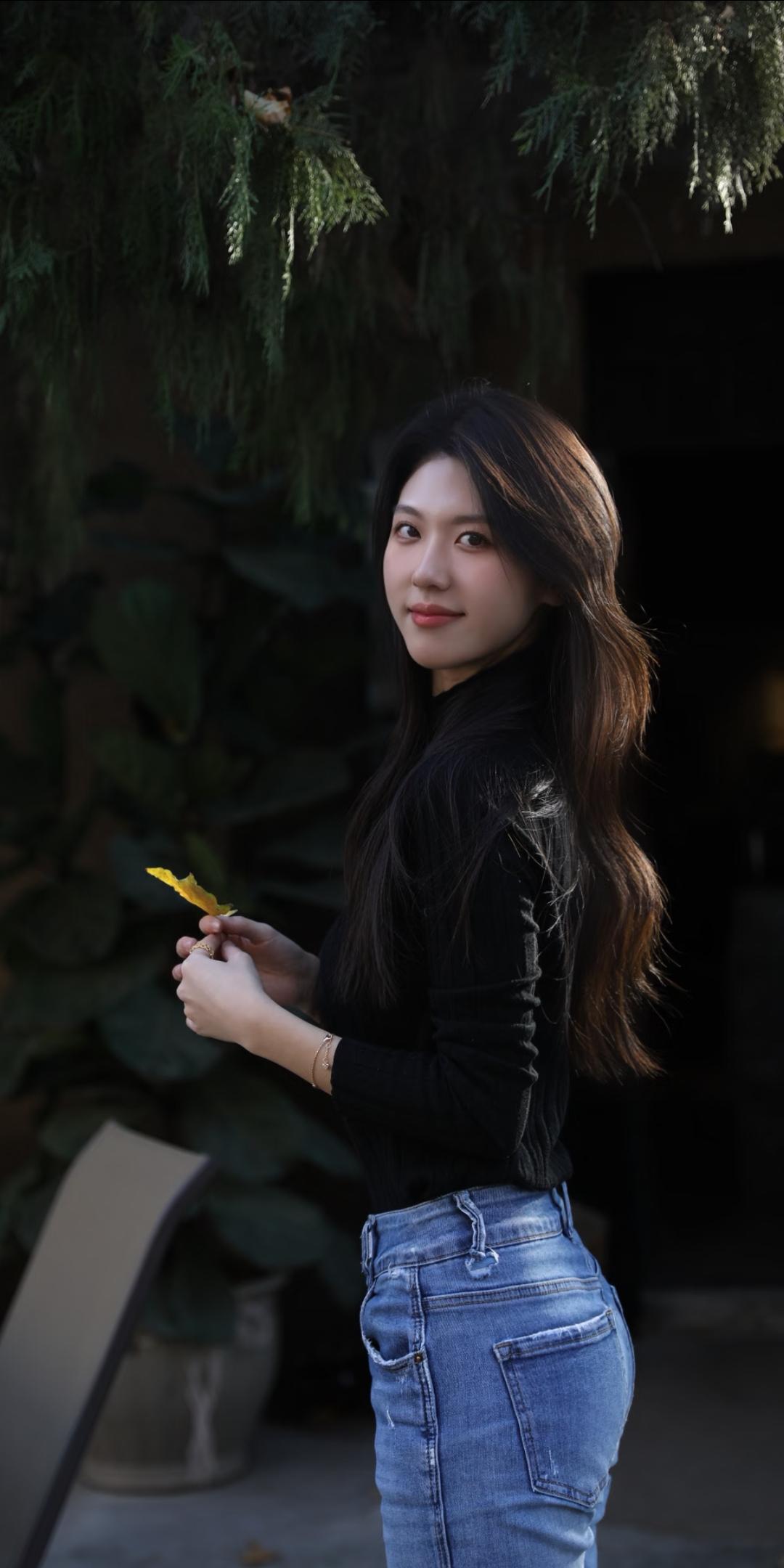 夜晚公园的神秘氛围,黑色长袖连衣裙搭配高跟鞋,优雅而迷人。